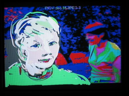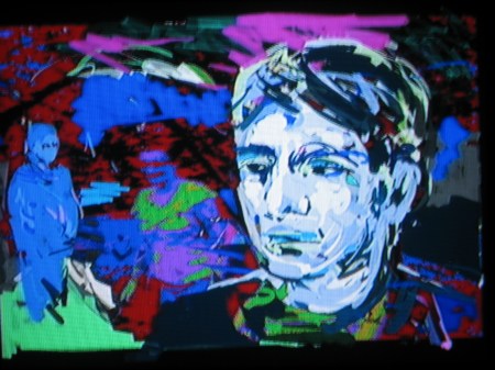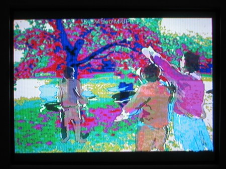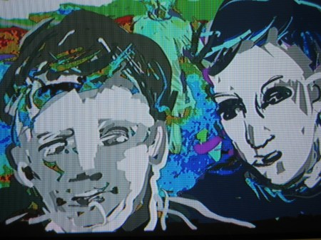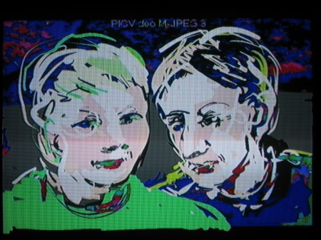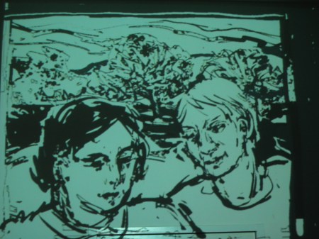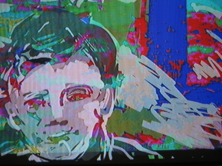Taking photos directly off the big screen with my small digital camera doesn’t result in very good quality images unfortunately. But I am very interested in the range of effects that can be achieved by superimposing black and white Tagtool drawing over our film footage processed through the Edirol mixer and I intend to do some more of this. In a later posting I hope to have some better photos and also some video clips of this work.