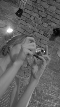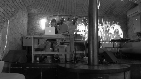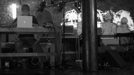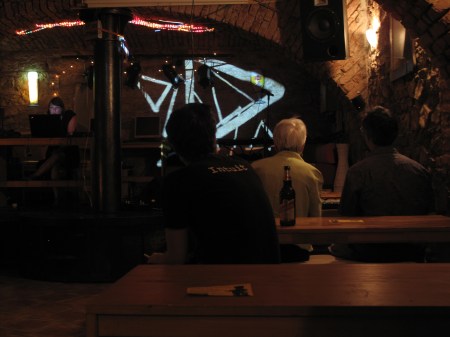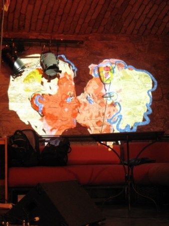 Recently we were invited by our friend Anja to accompany her performance at the Stutterer Music Series (www.stutterermusic.com) in Prague. There was very little time for us to prepare and Anja wasn’t familiar with the venue so we packed up the Tagtool and arrived early to set up all the equipment and have a quick practice session before the performance. Though we could have used the white screen on the stage we decided that we would project directly on the brick wall – as it turned out a really good decision because I had a larger area to work on and the drawing had an interesting texture. Anja describes her music as ‘slow groove electronic improvisation’ (Hear samples of her work at www.myspace.com/akitay). I drew and Dima did the animation – an improvisation consisting of mostly abstract shapes and geometric patterns.