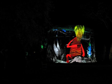 I noticed there were people in the audience setting up their cameras and tripods who had been at the Saturday performance too and they were rewarded on this last evening with a delightful and colourful animated sequence of fairytale images including this amazing pink sea monster and mermaid. A very nice finale!