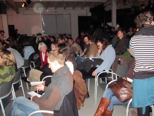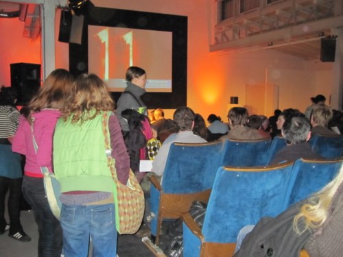 As these photos show, there was a large audience and it was the first time we had had the opportunity to see the finished version on the big screen – which was very exciting! We had the stop frame Super8 footage of my Tagtool drawing for this film transferred to mini DV at Cineco in Amsterdam. (The ‘homemade’ telecine version and photos of my Tagtool performance is on the blog – 22 September 2009). I will post a video of the final version at a later date.
