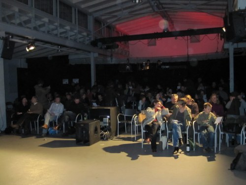When we arrived we were happy to find that the theatre, though quite small, had plenty of space for all our equipment, a beautiful big white wall behind the musicians and a ceiling mounted projector. The theatre sound and lighting technicians got everything ready but when we tested our equipment there was a problem – Dima had quickly to reconfigure all our prepared material to match the (lower) resolution of this theatre projector. (He managed to complete this task with only minutes to spare before the performance!). Jörg Stefke made the video documentation and all of the Tagtool drawing was captured directly in the computer. This meant that Dima would have plenty of material from which to make a video of the whole event.