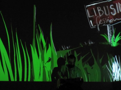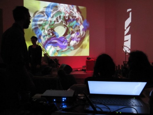 For the first jam session they had the projectors focussed on one wall only behind our new performance corner but on Sunday they were able to reorganise the set up to have all four projectors and two Tagtools working so that it was possible for two people to draw together across both walls – a really huge and exciting projection area! Here are a few photos that I took with my little camera.