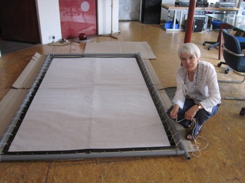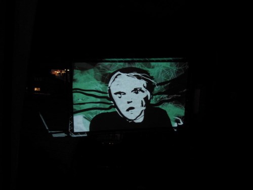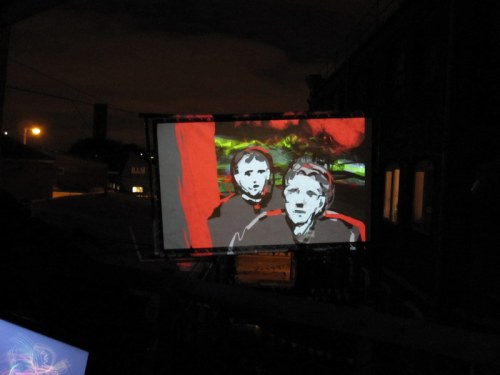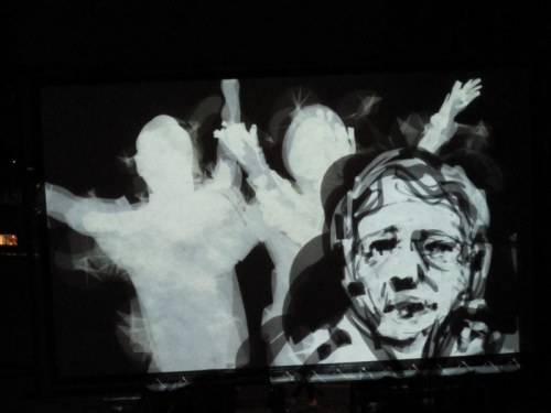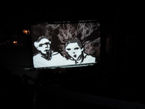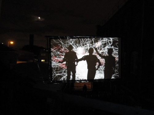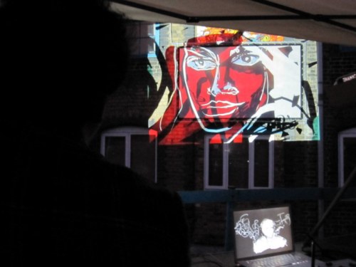 Despite a shower of rain that fortunately didn’t last very long (and under the gazebo we, and all our equipment, were completely dry), the Friday night party went on till morning so there was not much time to rest before we had to get ready for the Saturday performance. We had been told that our biggest audience was likely to be on Friday night but there seemed to be just as many people on Saturday – which was great! There was a lot of interest in the Tagtool and after we had been drawing for some time, although there wasn’t very much room under the gazebo, Lennie invited one or two people to come and have a go – which was a very good idea, as it gave us some time to have a much needed break from drawing!