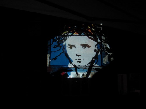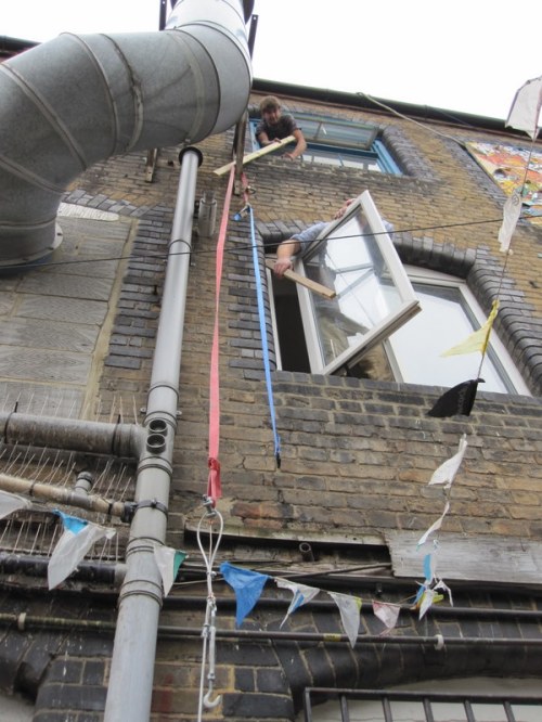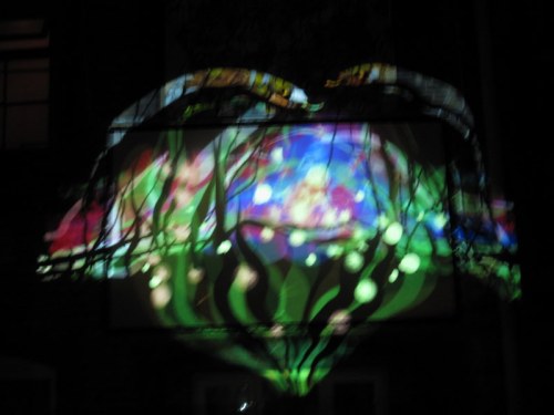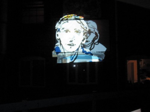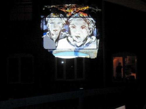 On the wall I think that these big, bold and simple images worked best. When I tried something more subtle with lots of transparency, like the piece below, it got rather lost in the pattern and texture of the brickwork and window frames.