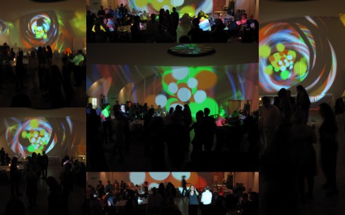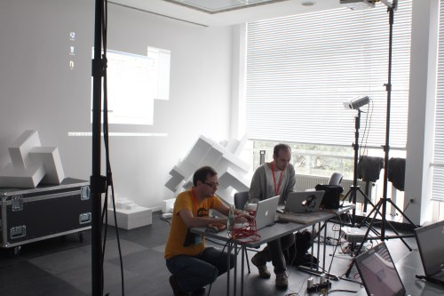 He used this Tagtool animation as a texture to map on some blocks of polystyrene. The photo below shows the studio set up for this workshop with the two course tutors, Chris Plant and Elliot Woods in the foreground.