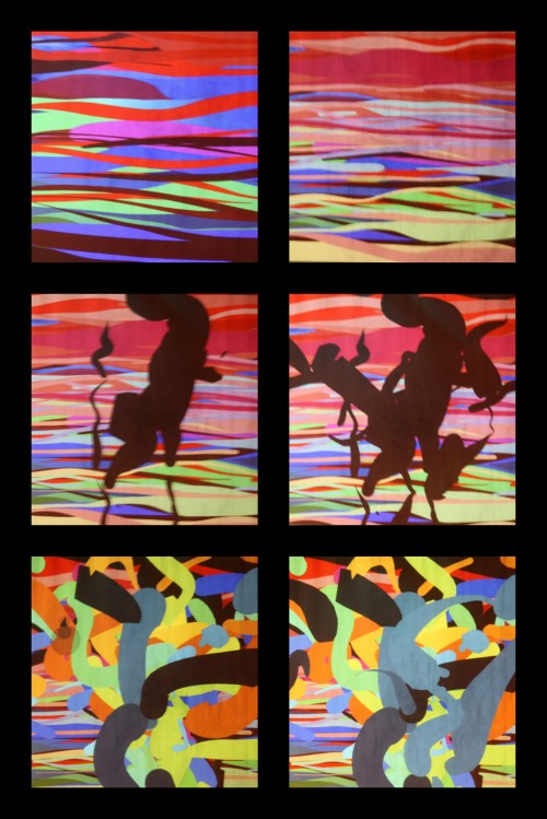 Both the musical accompaniment and the length of this performance meant that I had an opportunity to exploit the full range of the mark-making possibilities of the Tagtool – and so it seemed appropriate that not all of my drawing was figurative. Below are two sets of stills from some of the more abstract sequences.