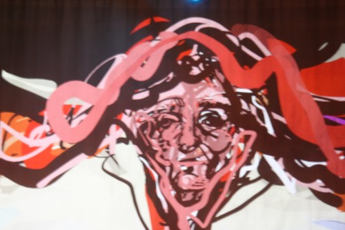Both the musical accompaniment and the length of this performance meant that I had an opportunity to exploit the full range of the mark-making possibilities of the Tagtool – and so it seemed appropriate that not all of my drawing was figurative. Below are two sets of stills from some of the more abstract sequences.