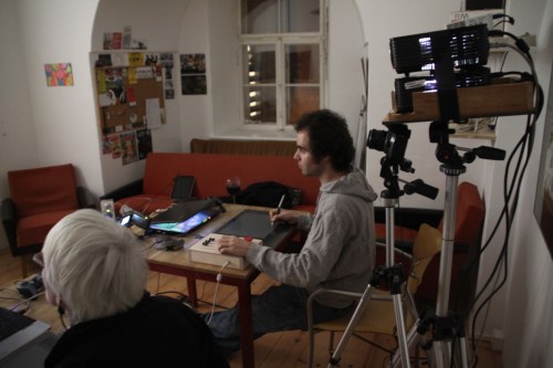 The room in which Dima set up our two projectors was not very large so our drawing area was much smaller than I am used to at home but once we began to draw I found it not too difficult to adjust to this more intimate scale. Although we captured the sessions in our computers the clip above is made from the video Dima captured in his camera. Dima was unable to use the computer captured material because all the areas of transparent colour that we had used in the session rendered as solid in the session manager (this is something that is important to remember if you use transparent colour and want to render a session!)