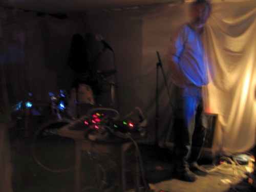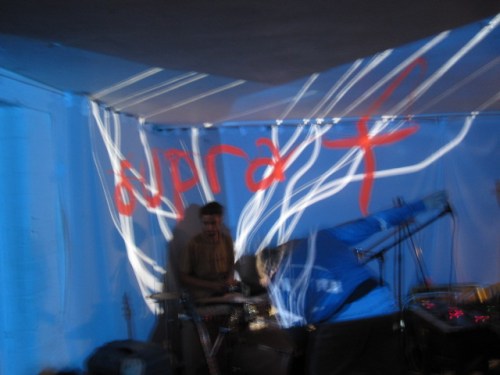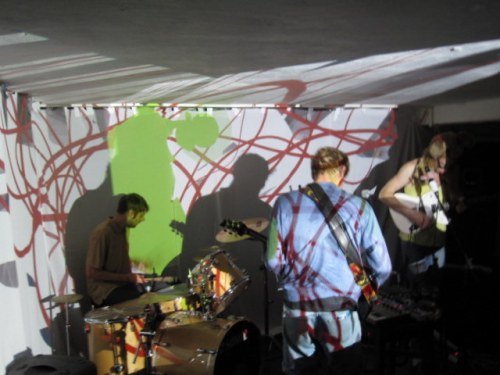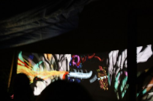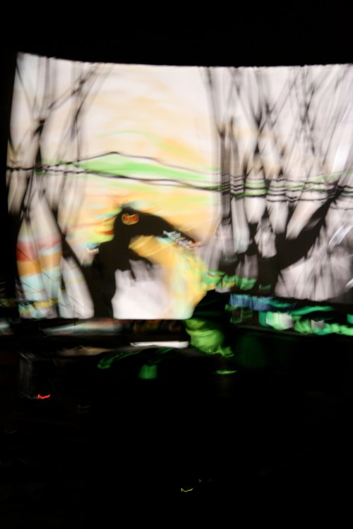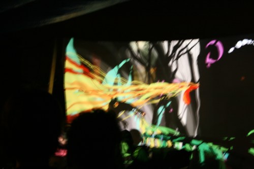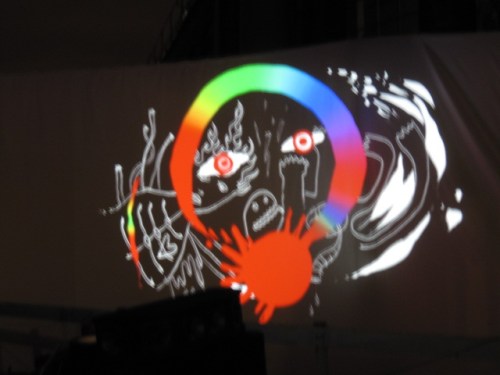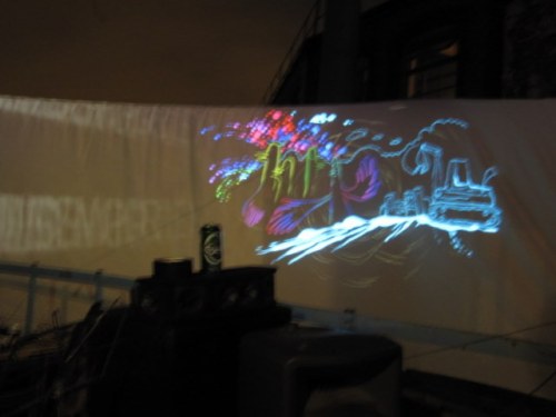 Most are like this one (the test drawing Maki did while Dima was setting up the projectors) – all out of focus and too dark! For our performances I was drawing with Maki, using two Tagtools and three projectors, with Supra+ providing the music. Although everything had worked perfectly in the studio equipment test in the afternoon, on Friday night for some reason my Tagtool didn’t want to start and I had a few anxious minutes before Dima managed to get it going.