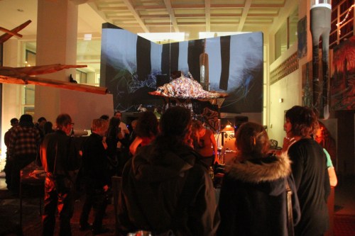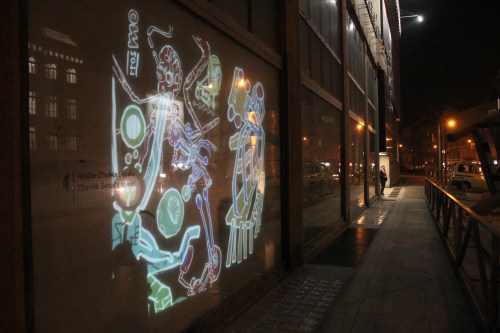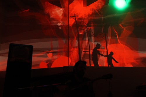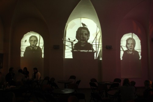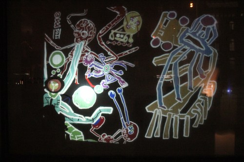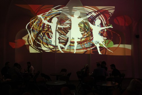 Our double projection covered the full width of the wall of the chill out room for the party – which was great for Tagtooling despite the fact that with coloured spotlights and the chandelier lit while the cold buffet was being served, the room was quite light. The drawing below, which had an animation of flying birds and a happy anniversary message for the opening of the reception, was to ‘set the scene’ for the first of the after dinner performances in the theatre, from the Brazilian percussion group