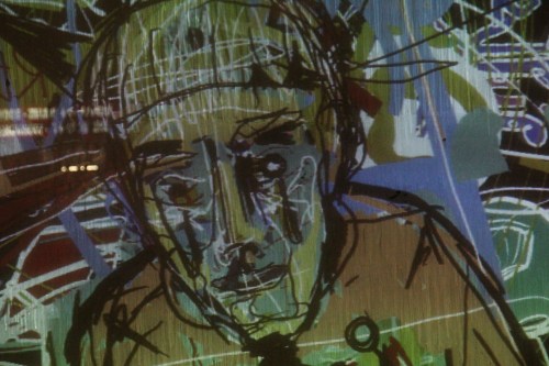 In this performance, for the live Tagtool drawing accompaniment to Max’s improvisation, I decided to make a sequence of entirely abstract visuals, concentrating on exploiting the different textural and layering effects that can be achieved using the transparency slider and fading.