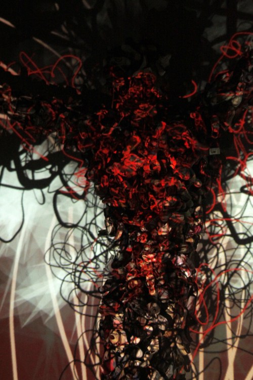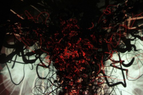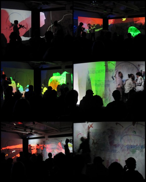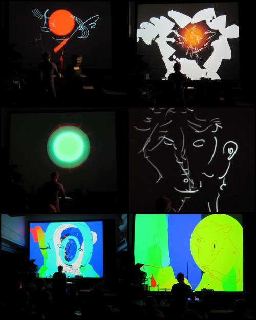 On Thursday there were two performances that I was really looking forward to see. The first, by RZM (Ritsche, Zasd, Marien and Maki), combined music, live action and movement, Tagtool and painting with pigment. Although I have seen videos of their physical theatre works I had never seen them perform live and, as so often happens, the live performance was a different order of experience entirely – I was mesmerised! In addition to the actual physical movement of the performers I found the interplay between illuminated surfaces and painted surfaces, the combination of pigment and Tagtool drawing, was particularly interesting – so I took lots of photos…