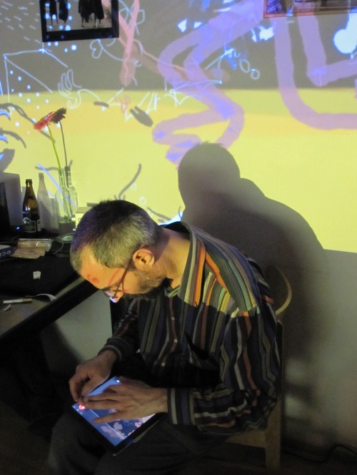 I made this collage of musicians Ritsche and Steve Buchannan and the drawings in the background are by Maki and Itzi. This session is from the first of the Tagtool Anthology programmes, where we all took turns to draw and play together in some ‘oldschool’ Tagtool jam sessions. This was serious fun for all!