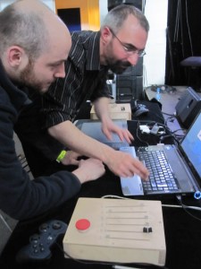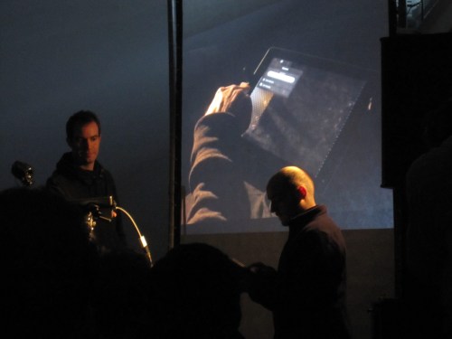 The two photos below show Maki and Itzi giving the very first ‘live’ public demonstration of their new Tagtool Touch for the Mapping Festival audience.