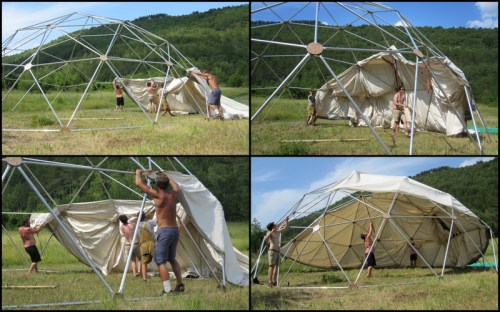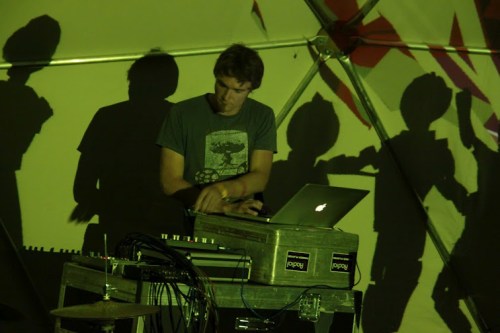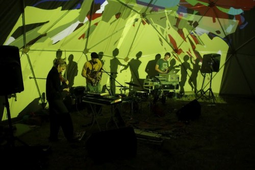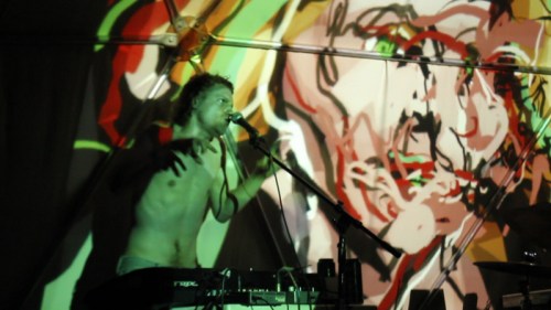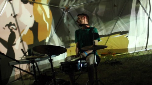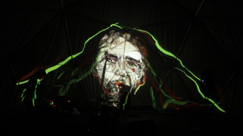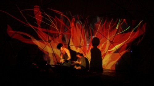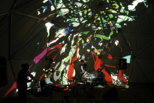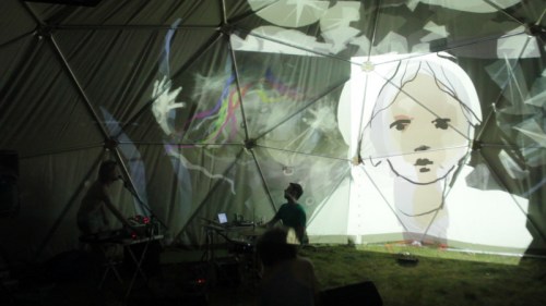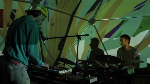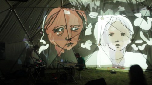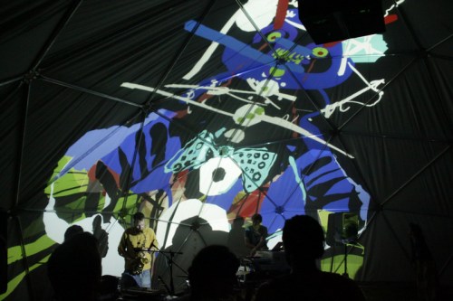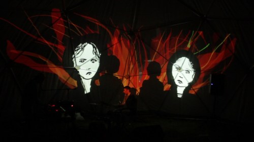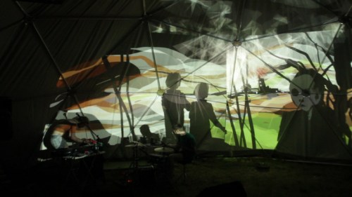 Jan and David played their own set on Saturday evening and I drew (using two Tagtools and three projectors – a complicated set up for me that involved switching pens from one Wacom drawing tablet to the other in order to develop different parts of my drawing, but by working in this way it was possible for the projection to cover nearly one half of the geodome structure of the tent). Below is a sequence of images from this performance; Dima also made a video recording which I will post later.