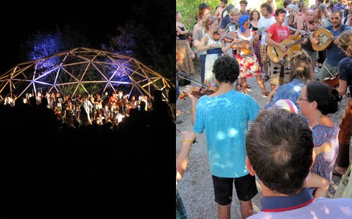 There were puppeteers, actors, jugglers as well as musicians – an enormous programme of all kinds of evening events as well as daytime workshops where performers could share their knowledge and demonstrate their expertise. The 70 strong ‘Orchestra Ethno Histeria’ made up of young musicians from many countries had been sharing their traditional music and playing together for the preceeding two weeks. They performed in the open air on the main stage; our performances took place nearby in the canvas-covered ‘electric stage’.