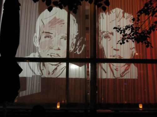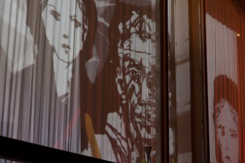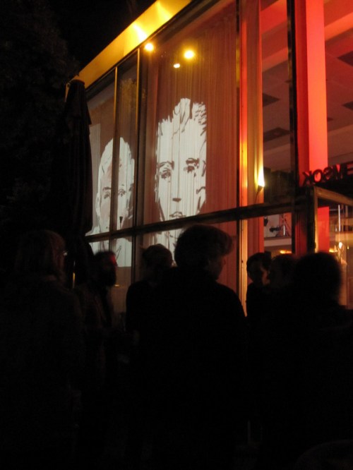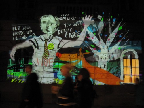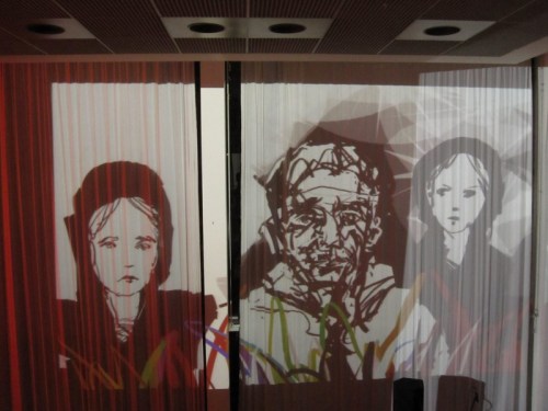 Above is an iPad screenshot of the final image that Maki and I drew together and below is a photo I took with my little camera of the same image as it appeared (with interesting distortions) when projected onto the façade of the building.