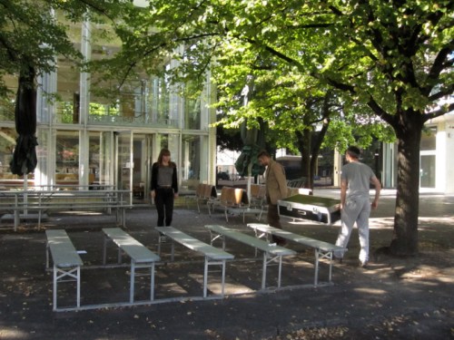 The photo above shows us sitting at the table with our iPads and, in the background, you can see the very neat solution devised by the crew for mounting the projector – it’s an upended folding pub bench with one leg acting as a shelf for the projector and the other secured to a rubbish bin!