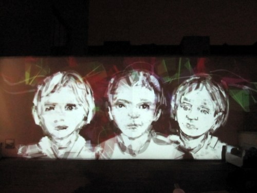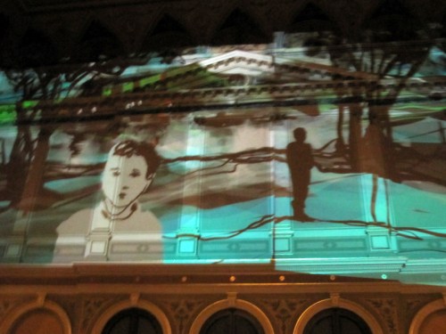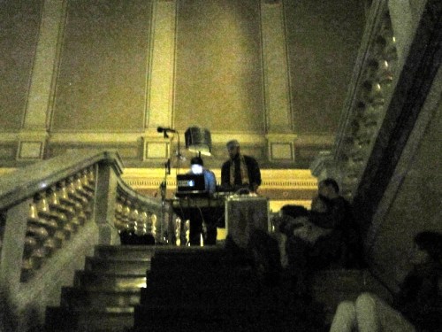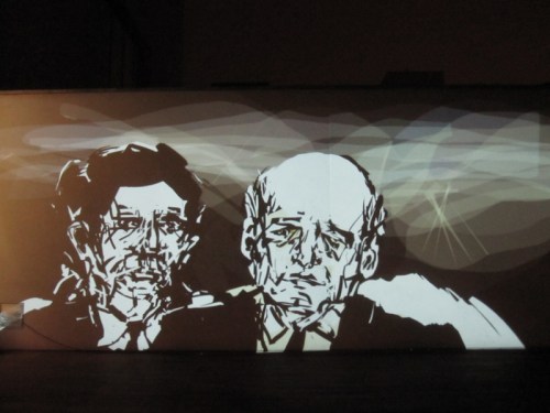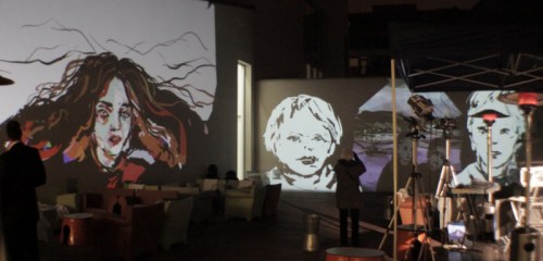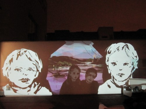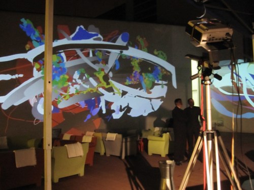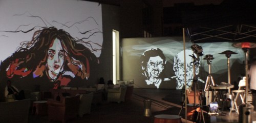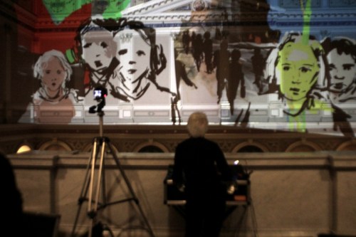 We used the gallery’s own powerful (and very expensive) Epson projectors for the performance, although as you can see in the photos above, mounting them on our tripods required some on-the-spot D.I.Y. adaptations by Dima. It was great to be able to use these big projectors as they gave a very bright image with beautiful strong colours – a clear case of expensive, high quality equipment producing the best possible result! From my position on the staircase landing I had a clear and unobstructed view of what I was drawing and with the two big Epson projectors it was possible for me to draw over the whole length of the upper part of the wall opposite.