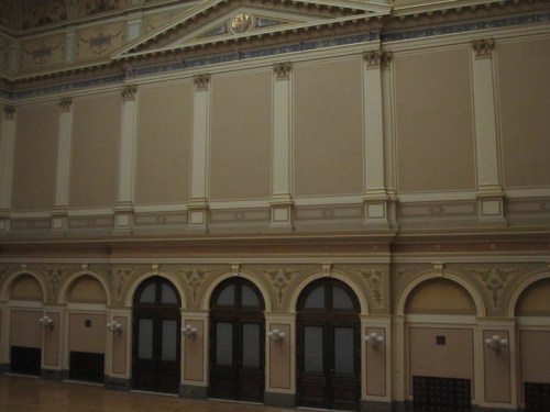 As the photo above shows, the central hall of this important neo-renaissance building in Prague is elaborately decorated in various shades of cream, mushroom and brown, with all the columns and cornice picked out in blue and gold – a very grand and prestigious location indeed for Tagtooling!