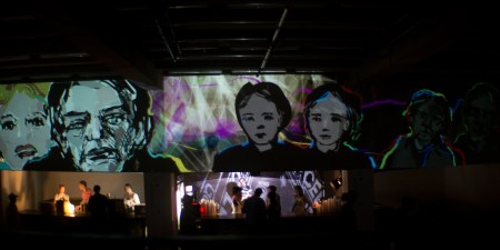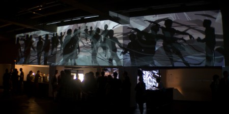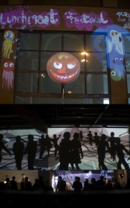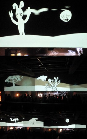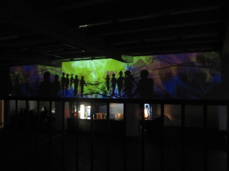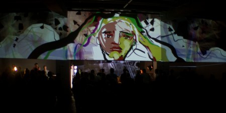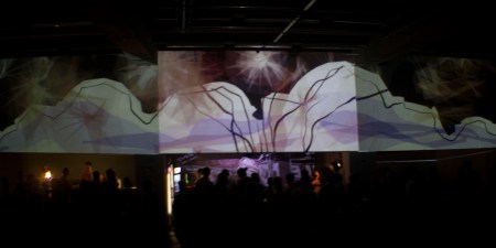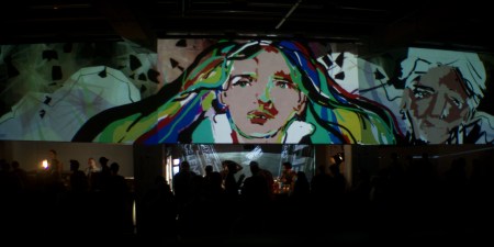 There were performances featuring both the ‘oldschool’ Tagtool and the exciting new Tagtool for iPad at this big audiovisual event which was held this year in Prague’s National Gallery building, the Veletržní palác. As well as using the cinema in the basement for the main stage, the event spilled over into the salon on the ground floor and there were projections on the stairway and in the basement bar as well. The iPad workshop was held outside the entrance while our ‘oldschool’ Tagtool was located in the bar adjacent to the cinema. For this set up Dima used three projectors, enabling me to draw over the entire length of the wall above the bar.