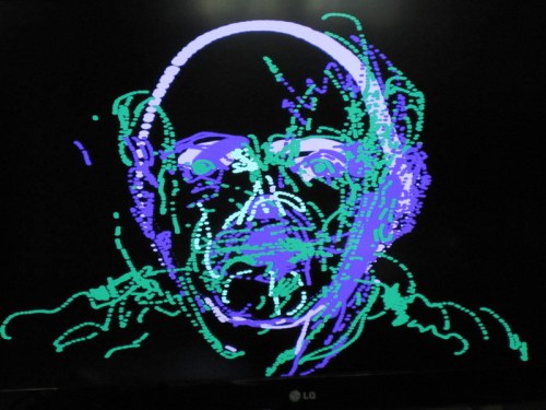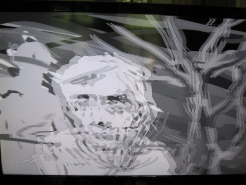 Now I am confined to my desk in the corner of the room and from time to time Dima asks me to ‘try to do a drawing’ on the TV monitor. I’ve been taking photos of some of these drawings – with the application being so full of bugs, both ‘known’ and ‘unknown’ that the process of drawing has gone from difficult, through simply weird to completely impossible!
