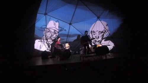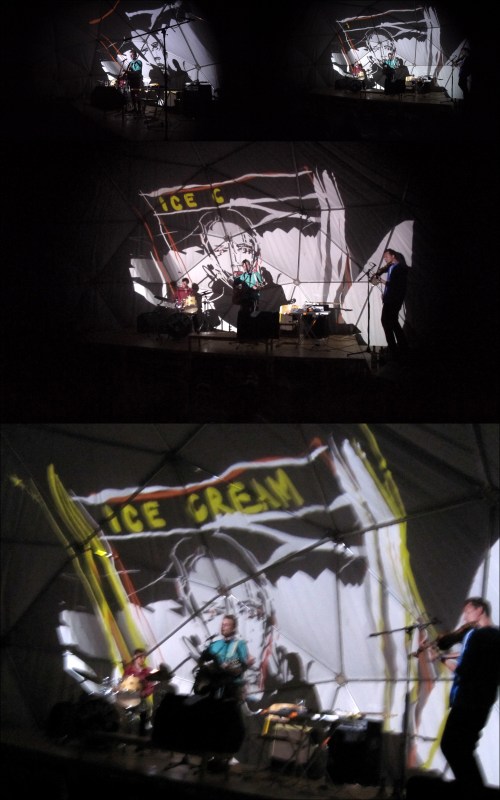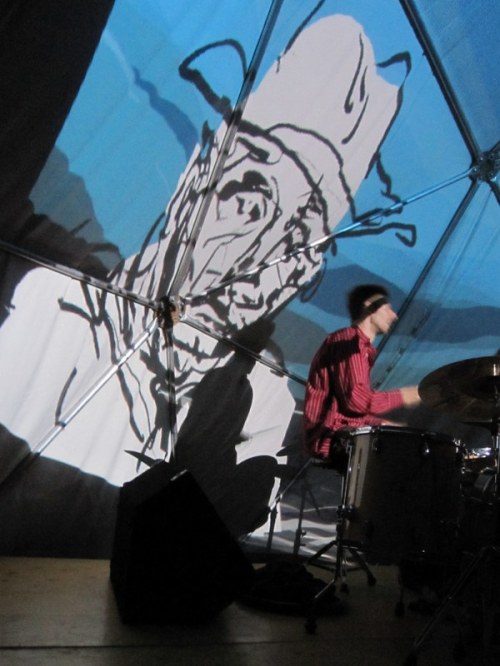 On all three nights of the festival K.U.N.T.Z. gave performances featuring Tagtool drawings projected onto the interior of the big dome tent ‘Drama’.