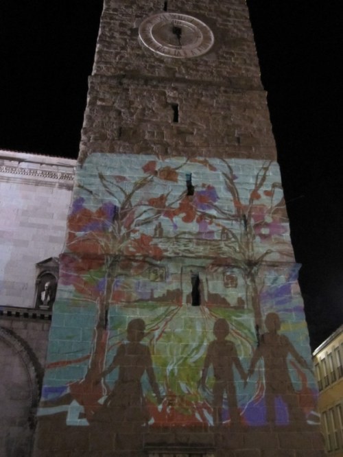The square is floodlit at night, so we knew in advance that ambient light would be a problem. To overcome this difficulty Dima had planned to use his new triple projector solution in order to give a brighter image for my Tagtool drawings but there was a problem with the electricity supply in the square and at the last minute we had to work off a generator, so we had to use our single short throw projector instead. This gave quite a good image, but not quite as bright as we had planned – a pity, as the tower was a really great surface for projection.