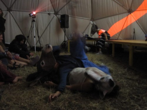 On Friday and Saturday nights the programme was ‘Hexentiere’ – a song cycle for seven of the animals associated with witchcraft and, as can be seen in the photo below, in these performances we asked some of the dancers at the festival also to join in the action wearing the donkey and wolf masks we brought with us.