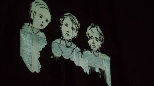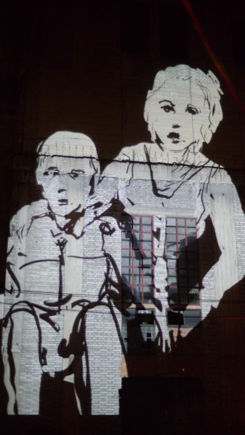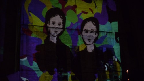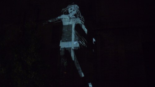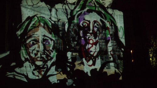 Our BenQ wide throw projector covered nearly the whole height of the building. It is only 3500 lumens but in these dark conditions it was possible to get quite bright images although, because as can be seen in the photo above, some of the colours were a bit dull, I drew mostly in black and white.