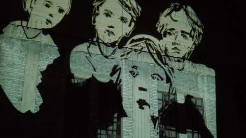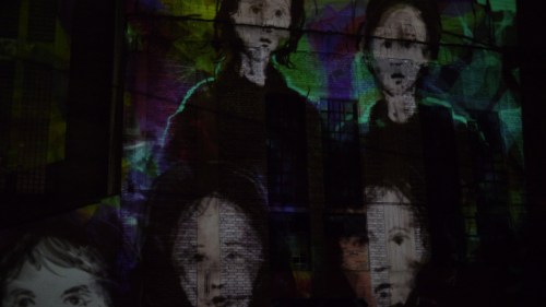 Of course in the video my drawing is speeded up a lot – there is no way that I could draw so quickly in ‘real time’! But doing this at least gives some sense of the succession of images and the development of the drawing. As the photo in my previous posting shows, this was a really great building for Tagtool projection and having the use of Lunchmeat’s 10,000 lumen wide throw projector gave wonderful super-bright images. (Thank you Lunchmeat!)