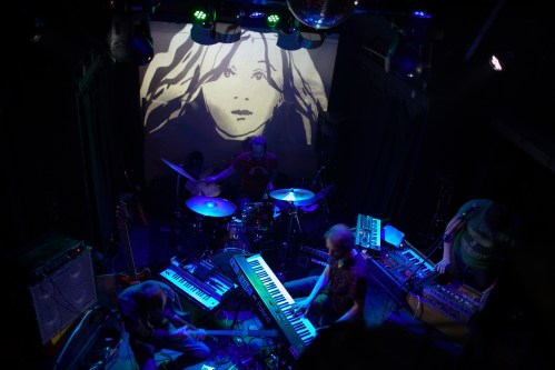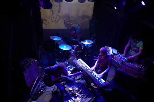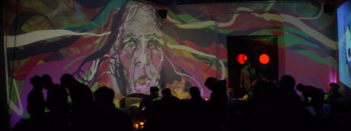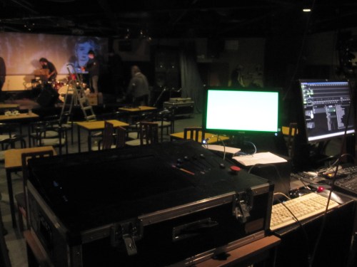 Above – Dima installing the Tagtool on the balcony upstairs for the visuals. He only needed to use one of our projectors to cover the small screen behind the band on the stage. The two photos below show well the set up with our visuals behind the band, as seen from the balcony and from ground level downstairs.