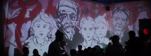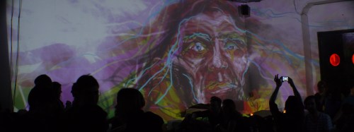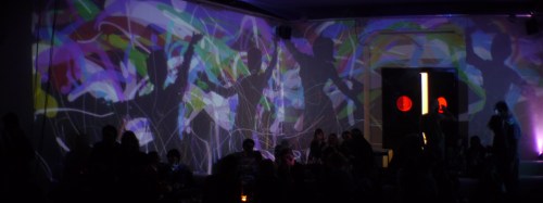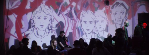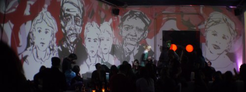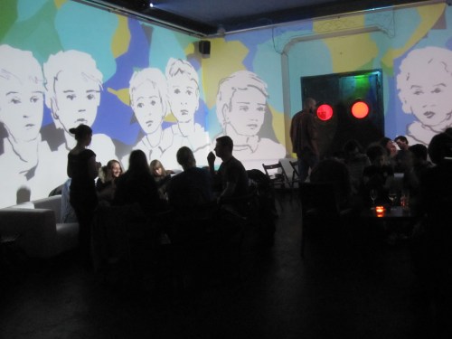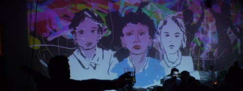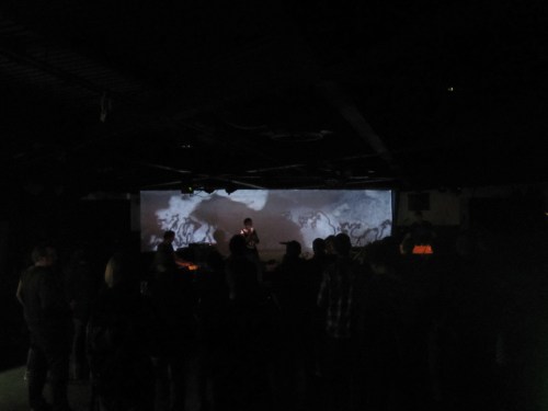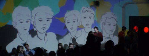 On 11 December Vložte kočku played at the opening of the Cena EXIT 2013 exhibition organised by the Design Department of J. E. Purkynje University. This event took place at the Galerie Emila Filly in an interesting old industrial building in Ústí nad Labem. The white-painted room where the concert took place had big windows, no stage and was quite small, but it had a very high ceiling with an enormous and very beautiful chandelier in the centre. Once the windows were covered by a large white canvas we were able to project on the whole wall behind the band and Dima set up a second projector so that I could make a little Tagtool for iPad animation on the ceiling around the chandelier.