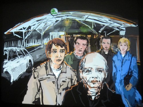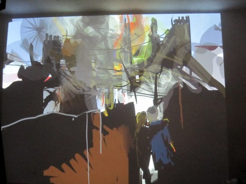As can be seen in the photos above, I worked out the three compositions in the studio by making my Tagtool drawing over a projection of a photograph of the building. The drawings were then speeded up to fit the required length of the programme. As part of the linking elements of the projection I also made these drawings of figures at the lighted windows.