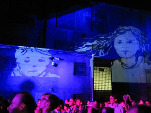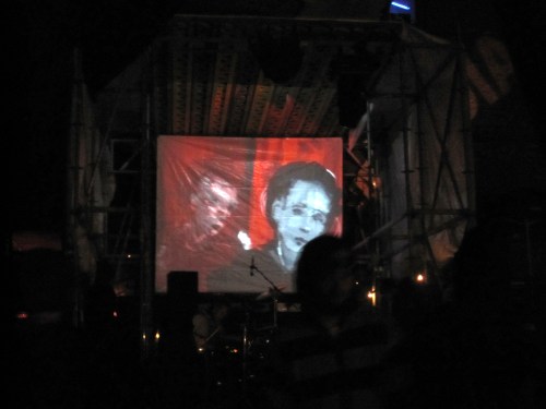 Our ‘on the spot’ solution this problem was to use gaffer tape to fix a white sheet for the projections to the eurotruss lighting rig above the band. This seemed like a good idea and it worked well for the fist few minutes of Vložte kočku’s set but under the heat from the stage lights the tape didn’t hold and first one side of the sheet then the other fell down among the musicians!