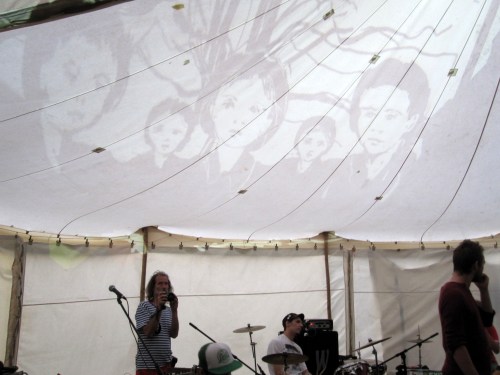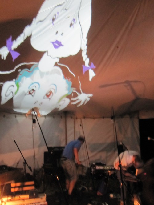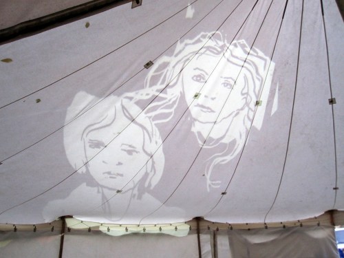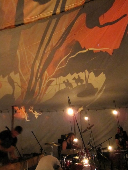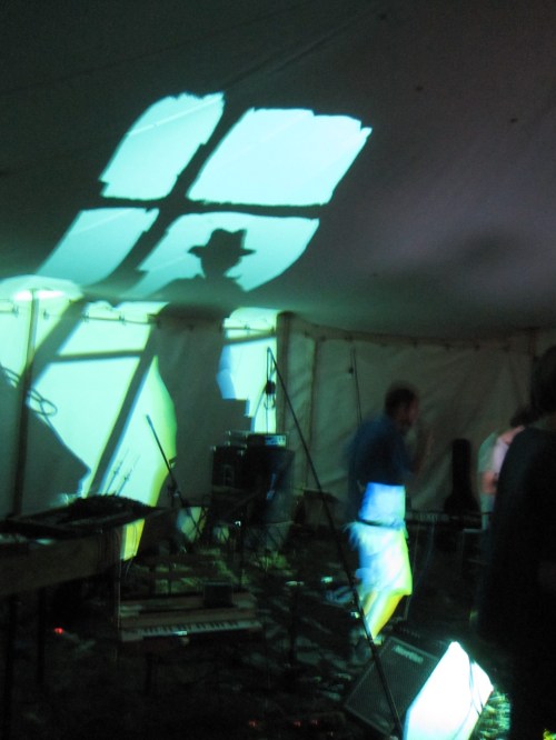 I’ll end this post with three photos of our last drawing of the night. On the tent roof I drew the silhouette of a man in a hat then the different versions of the image were made by Dima changing the colour in the second projector which was positioned on the ground in front of the musicians and cast the shadows that connected with my drawing.