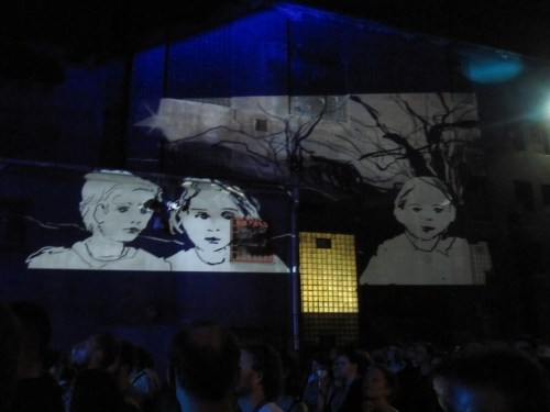 For our next ‘stop’ we returned to the Czech Republic for the festival at Boskovice, another historic town in the south of the Czech Republic. Outside the walls of the castle ruins there was a beautiful white traditionally-shaped circus tent where the music performances were to be held. This programme was a real Vložte kočku ‘family event’ – the central performance was by VK but the evening began with a set by Ufajr, one of whose members is the keyboard player with the band and closed with a performance by Mutanti hledaj vychodisko. Although it was still bright and sunny outside when we set up the projector Ufajr asked me if I could do some drawing for their set – and of course I said yes, which was a good idea as it gave me an opportunity to get to used to the huge amount of distortion that I had to contend with when drawing on the tent roof.