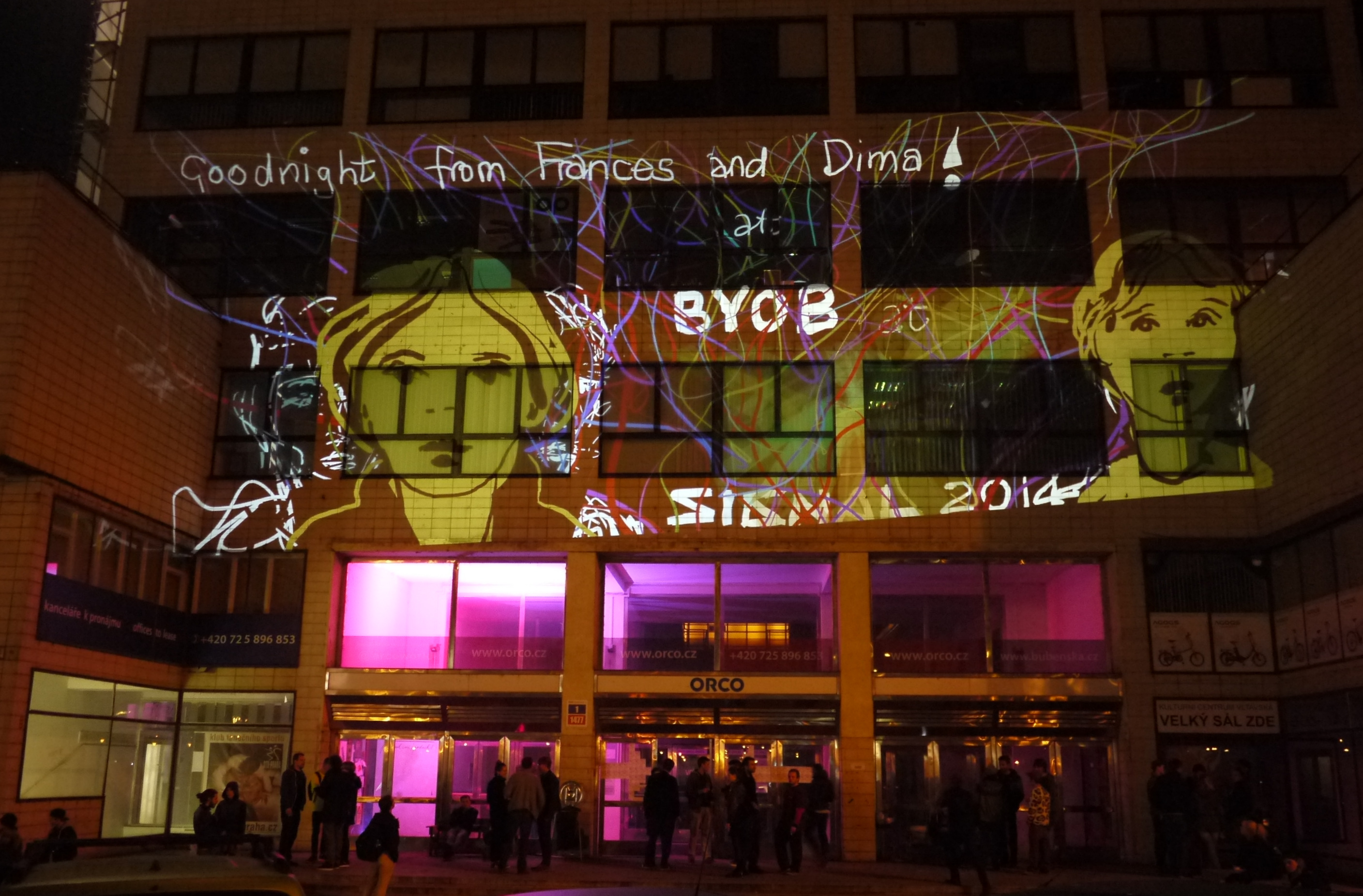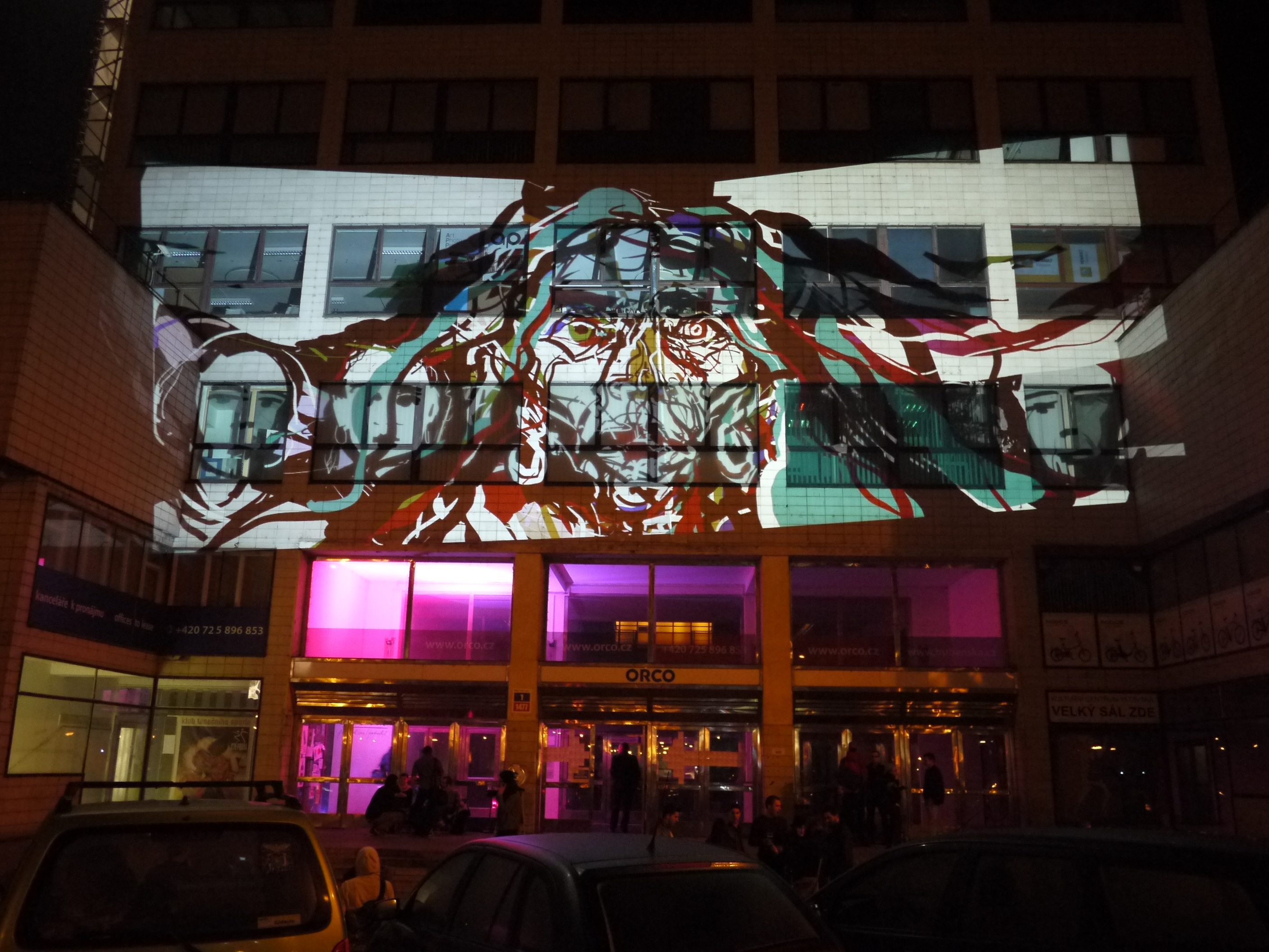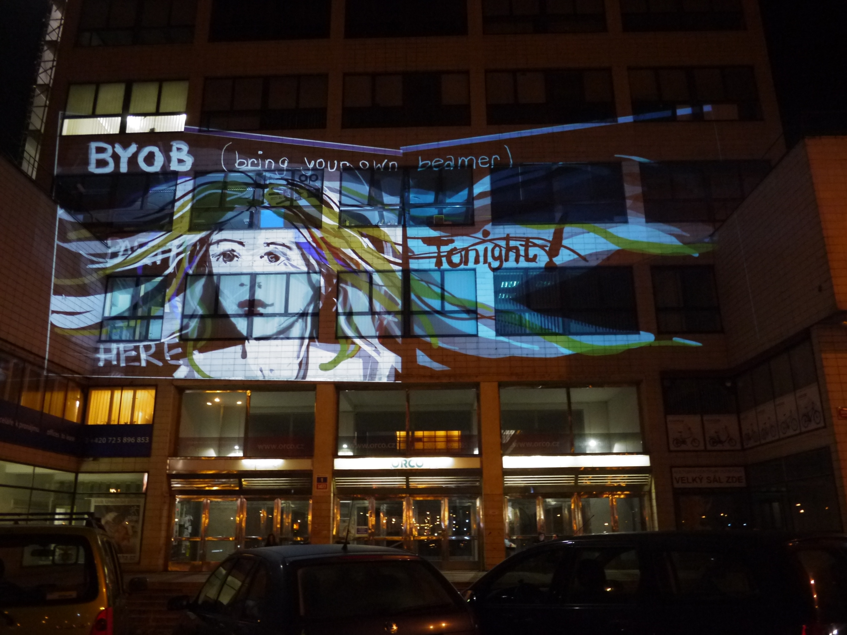 This BYOB event at the Signal festival, organised by Nicola Pavone (VJ Luper), was held at Podnik Club in Bubenska 1. This impressive Functionalist building formerly owned by the Prague Electricity Company is now home to a variety of design studios, offices and young creative companies. We have Tagtooled here before, as it’s where Lunchmeat have their HQ and club NEONE, but it was the first time that I had drawn on the outside of the main entrance to the building.