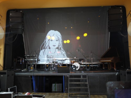 The two photos below show how the stage lighting altered the whole atmosphere of my drawing – which added an interesting extra dimension to the visuals!