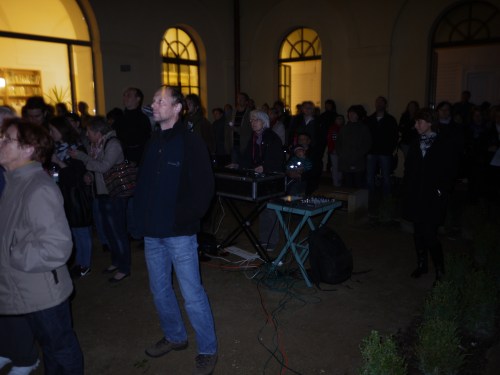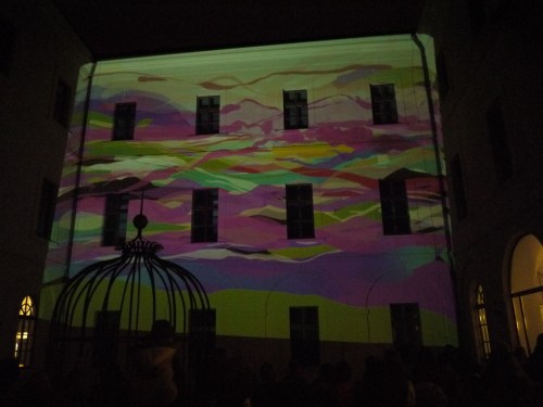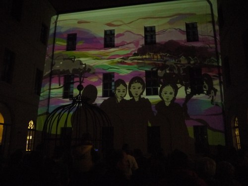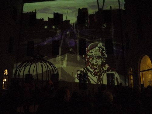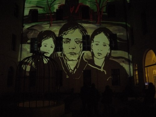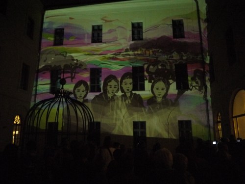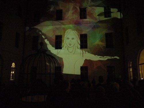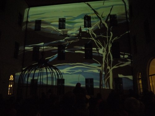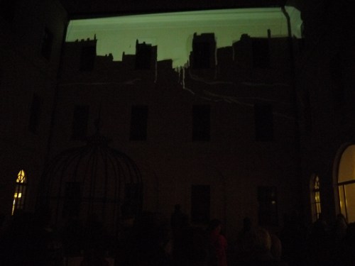 The performance was held in the inner courtyard of Slany Local History Museum. The projector was set up beside the decorative ironwork of the well to avoid it casting shadows on my drawing. As the weather was cold and dry we didn’t need to shelter the equipment under a gazebo so I positioned the Tagtool near the middle of the courtyard and by the time the performance began, despite the cold, the courtyard was crowded with people, both adults and children.
