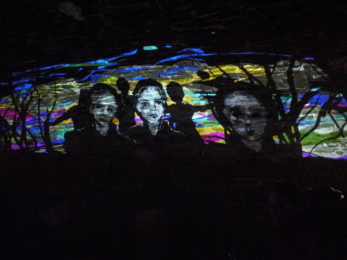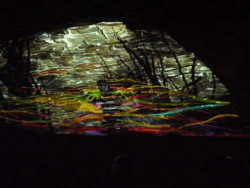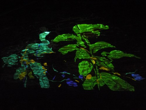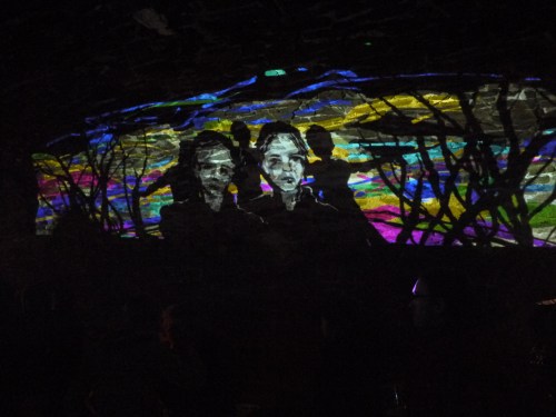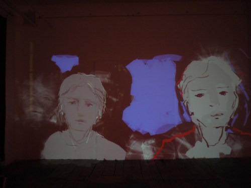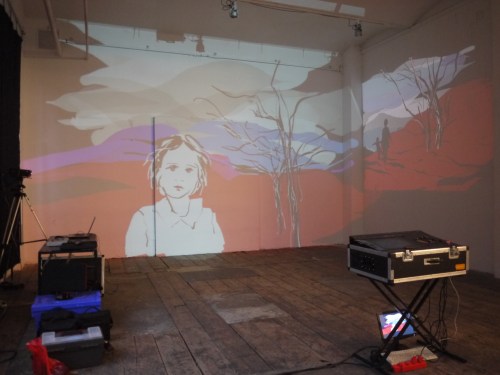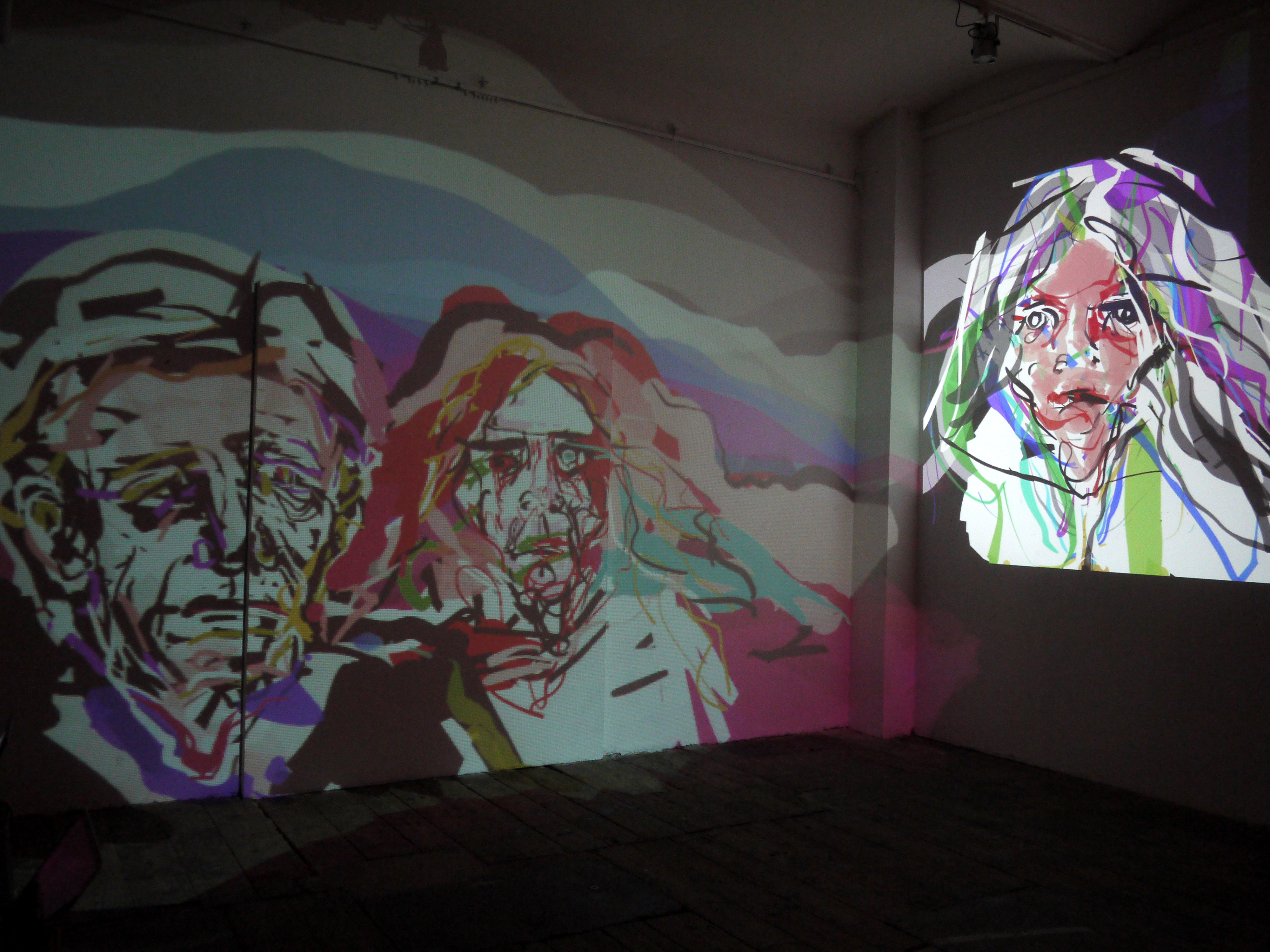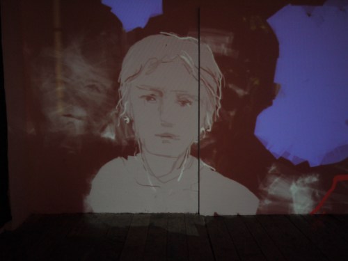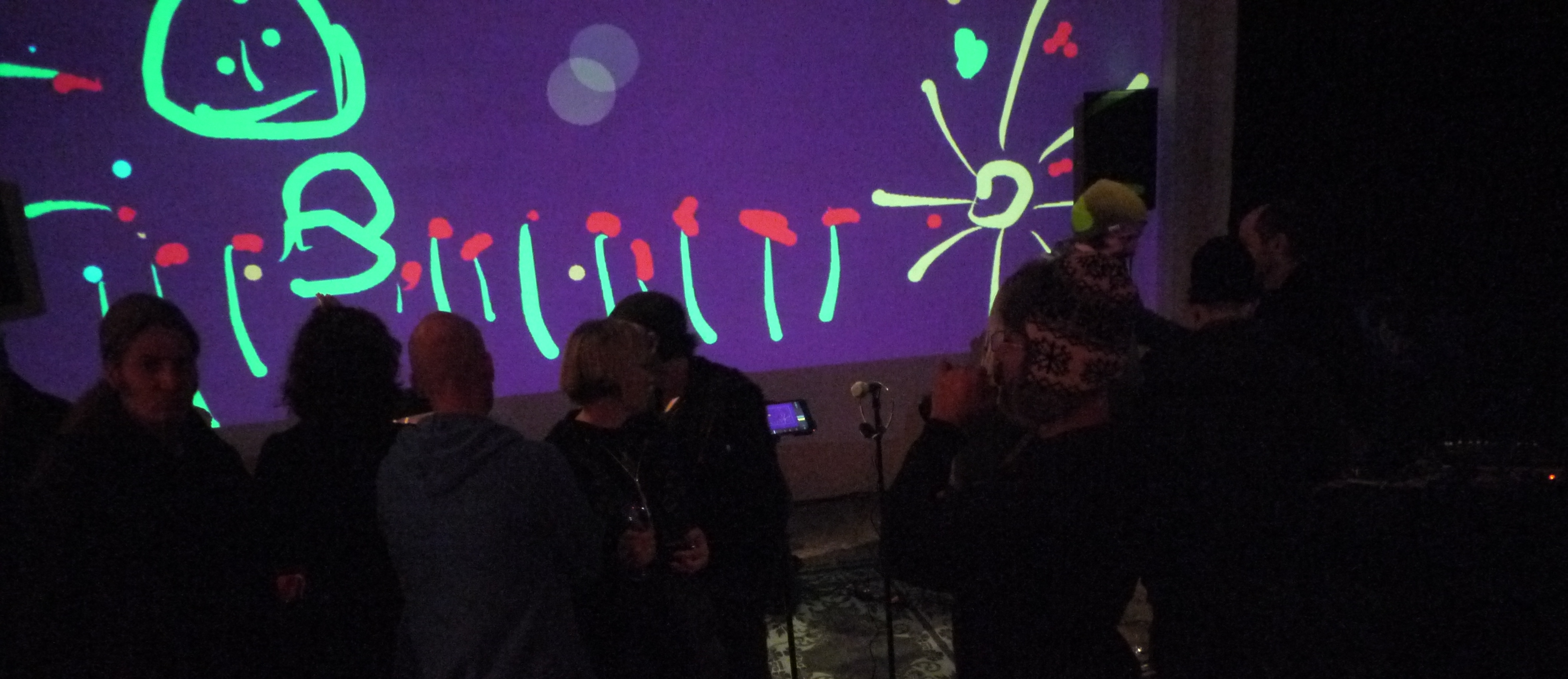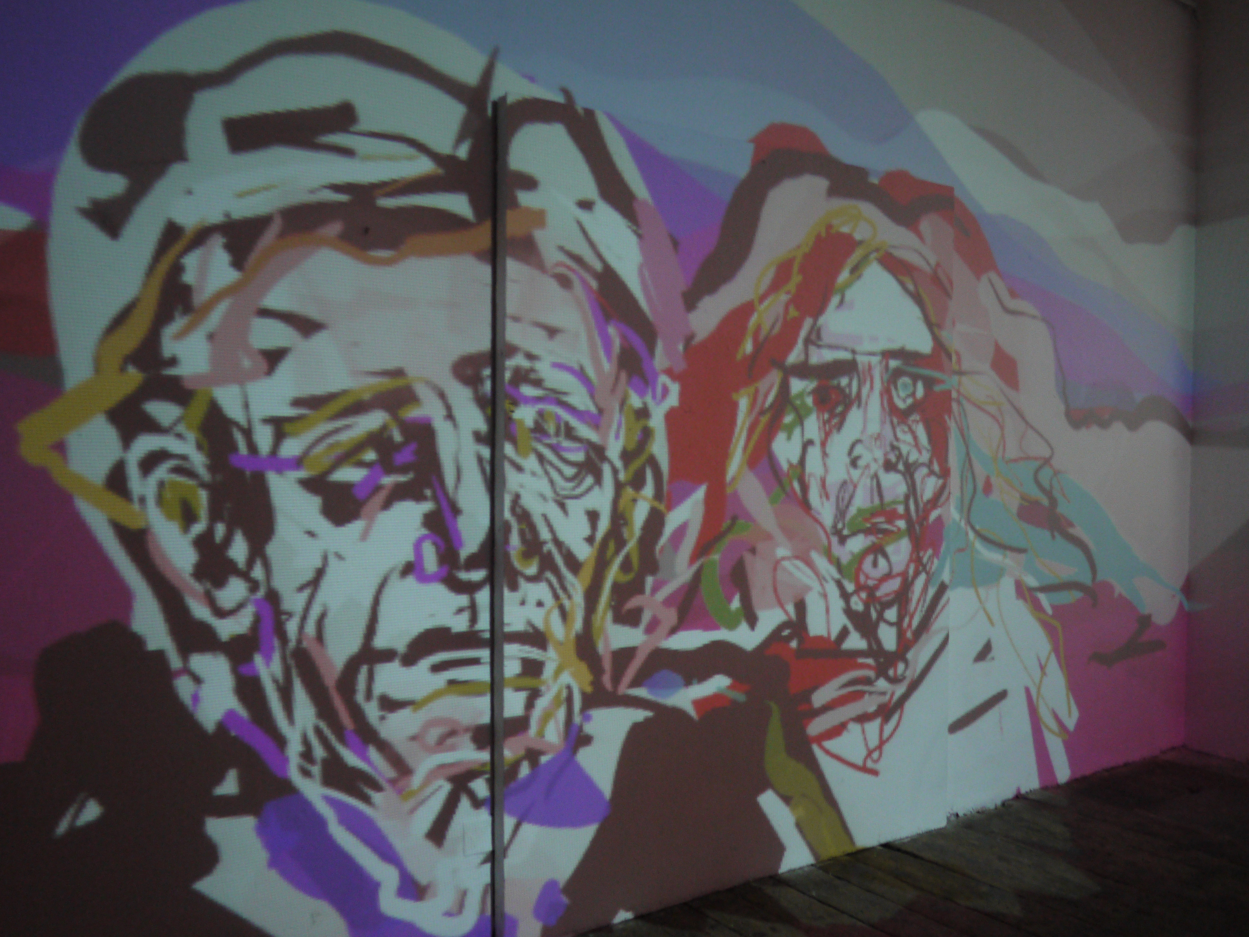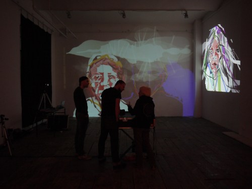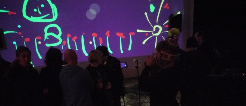 Using these two different projectors made colour matching across the two walls quite difficult; while the ‘short throw’ gives a much larger image, the colours are less bright and, except in total darkness, it’s not possible to get a real black. Also with the ‘short throw’, when you are close up, the drawing appears as if seen through a mesh (which isn’t always visible in these photos). But despite these limitations, our ‘old-school’ set up worked well and I spent a most enjoyable evening just standing drawing….