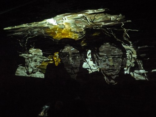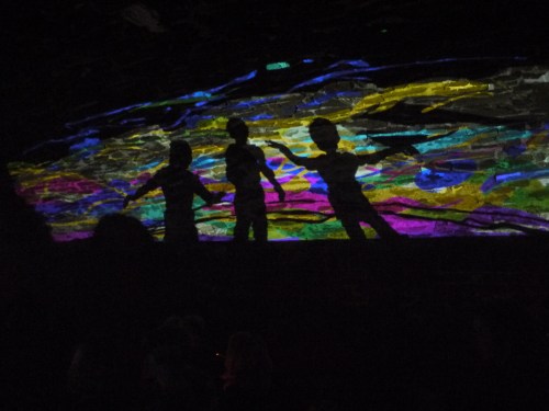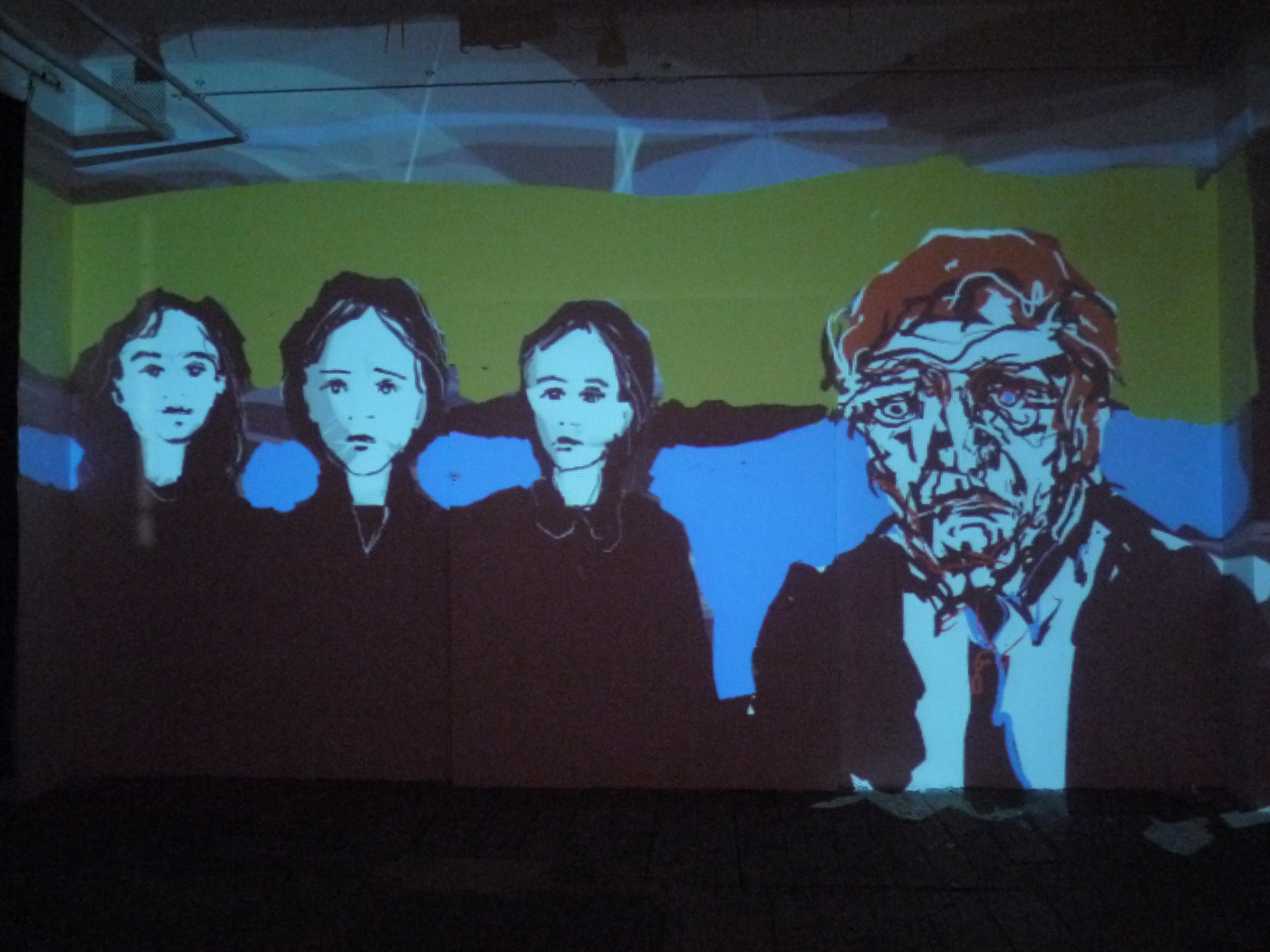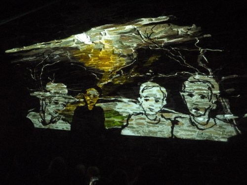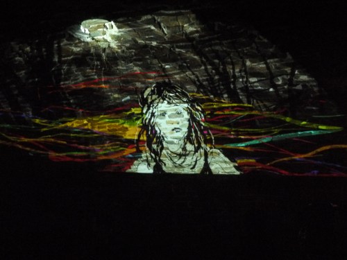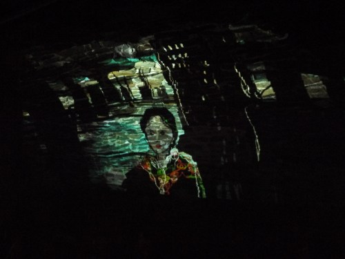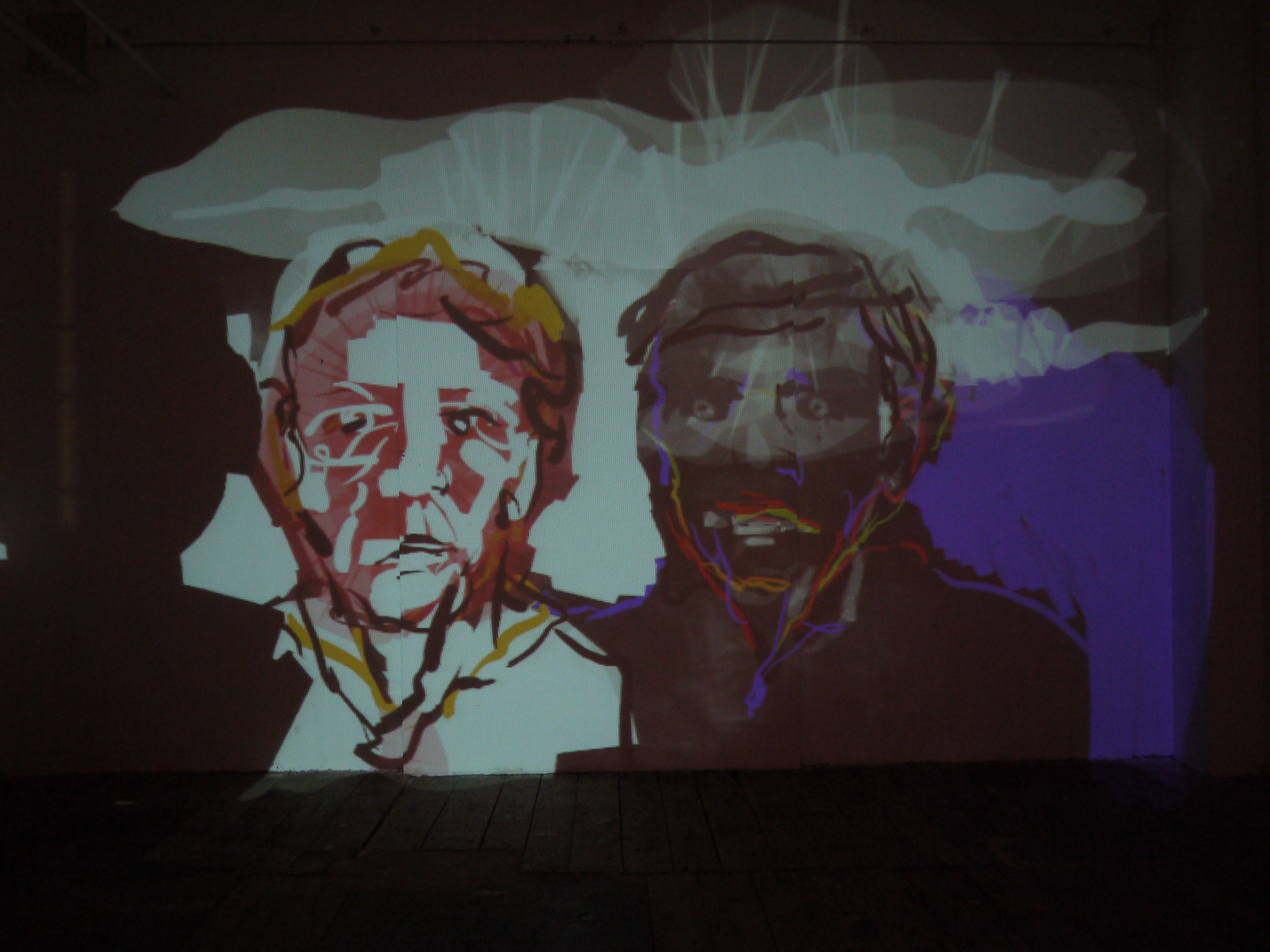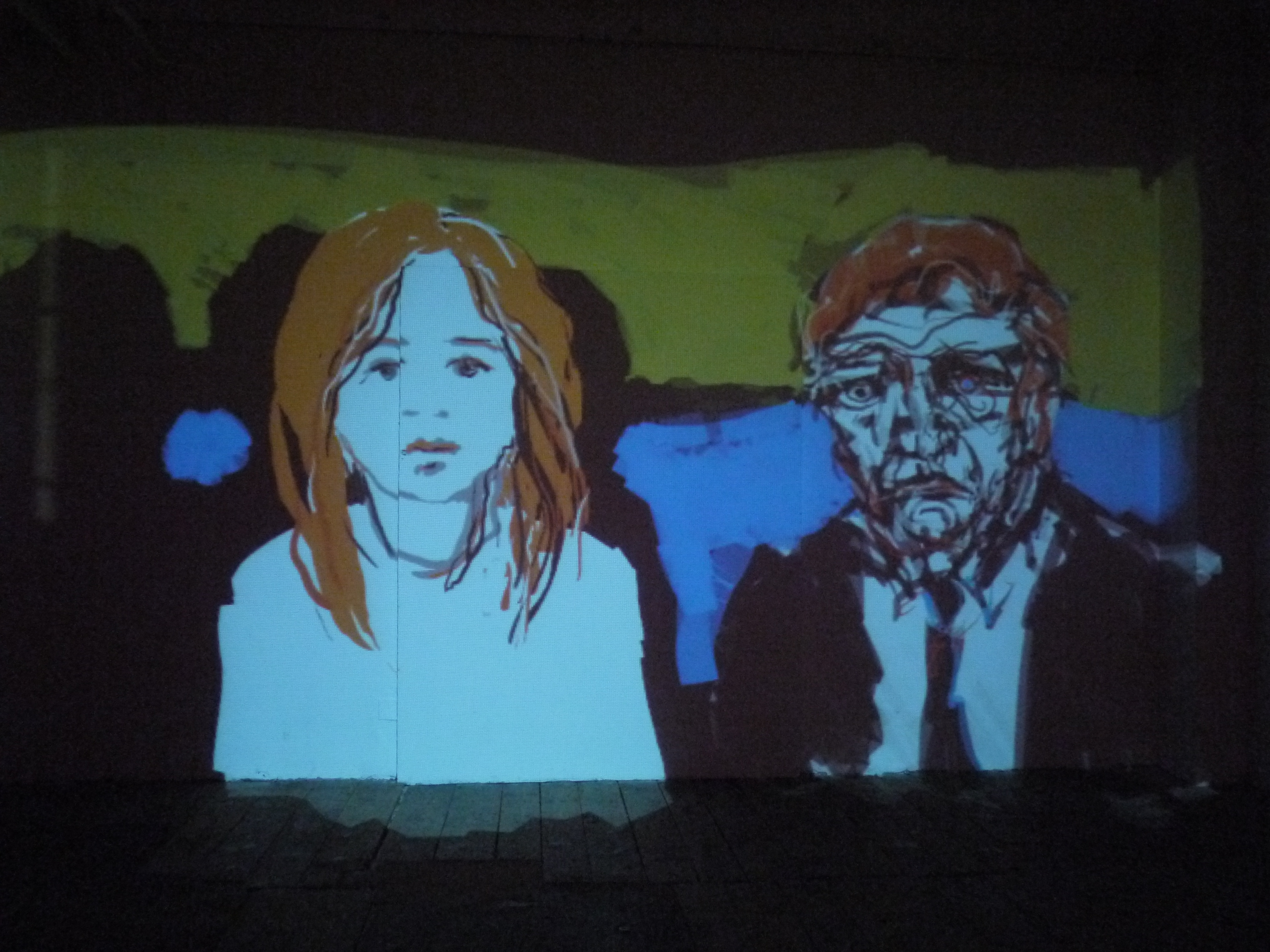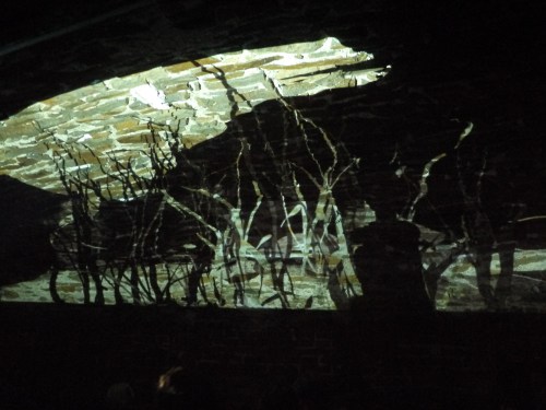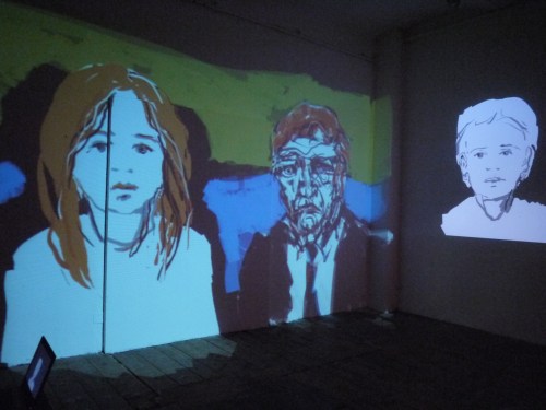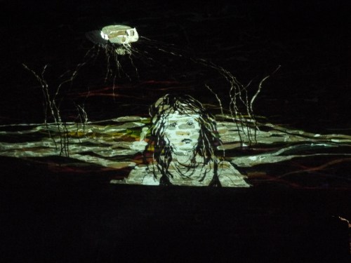 Using these two different projectors made colour matching across the two walls quite difficult; while the ‘short throw’ gives a much larger image, the colours are less bright and, except in total darkness, it’s not possible to get a real black. Also with the ‘short throw’, when you are close up, the drawing appears as if seen through a mesh (which isn’t always visible in these photos). But despite these limitations, our ‘old-school’ set up worked well and I spent a most enjoyable evening just standing drawing….