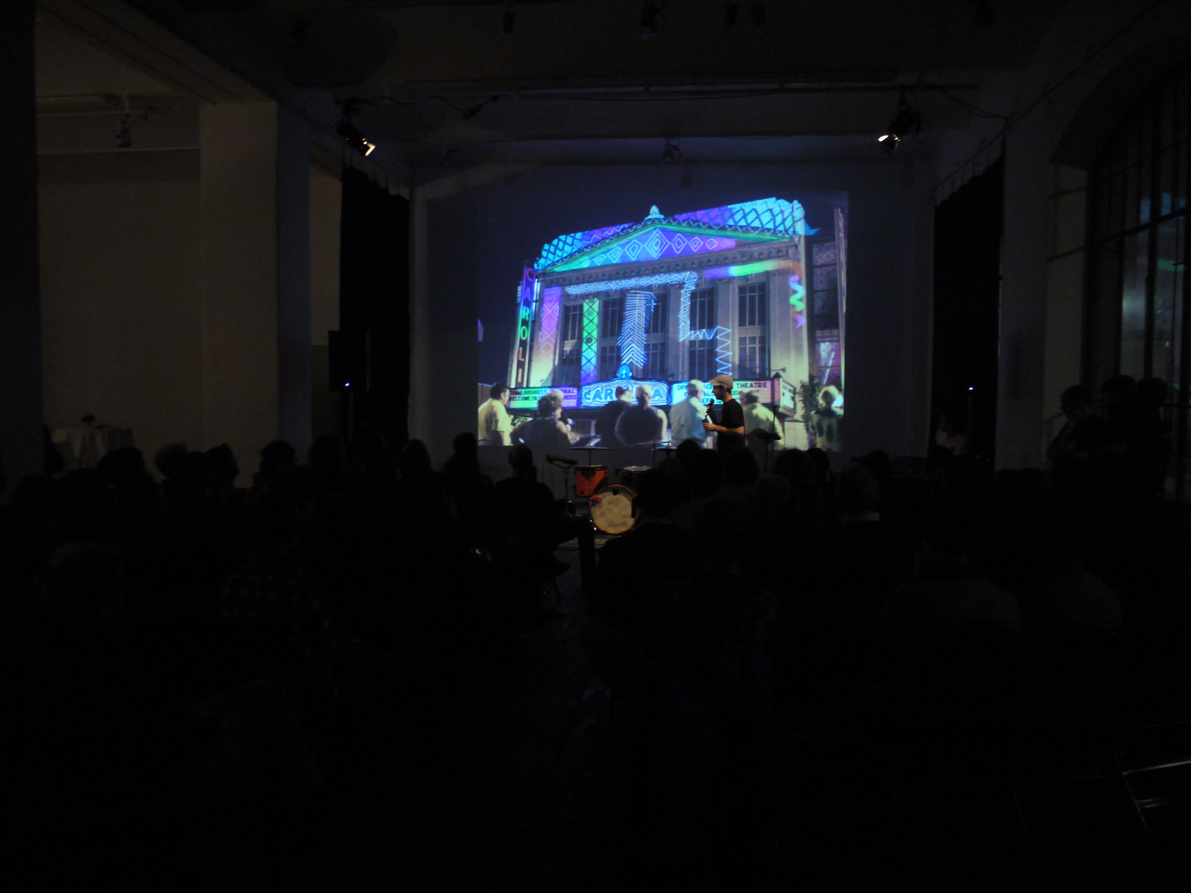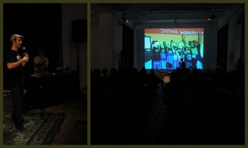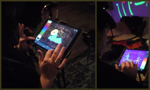 The evening began with Maki making an illustrated presentation of the brand new Tagtool for iPad. The OMAi team have been testing it on their recent American tour (running workshops for young people in Greensboro, North Carolina as well as giving outdoor performances at a number of different locations, one of which is shown in the photo below).