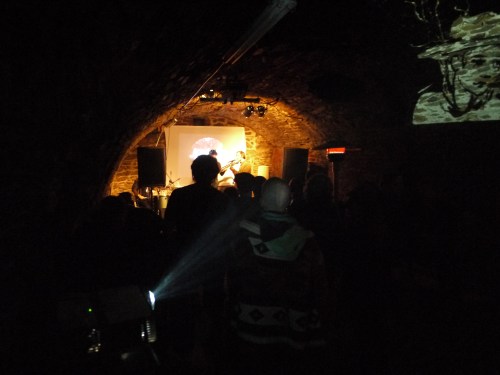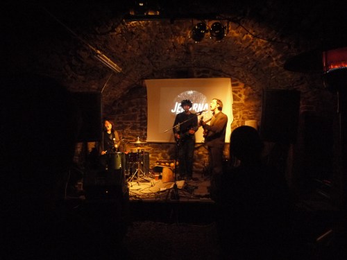 Our friend Martin from Suncab invited us to do some Tagtooling at a gig in this interesting cellar venue in Strakonice on Wednesday evening. I decided to draw on the wall rather than the very small screen behind the performers. As all the lighting was focused on the stage it was very dark (great for drawing!) and the texture of the curved stone wall provided a nice extra dimension to the drawing.