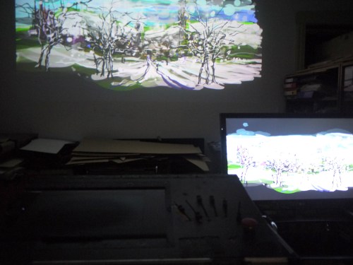 Over a photo of the front of the museum I prepared this Tagtool drawing in the studio, which Dima captured so that it could be speeded up to last about 15 minutes when projected onto the facade of the building. (The landscape, with Slany hill in the background, was loosely based on historic engravings in the museum’s collection.) The plan was that on the evening of the performance, as we had done previously at Mlada Boleslav, this projection would run several times – giving me an opportunity to do some ‘live’ drawing in between.