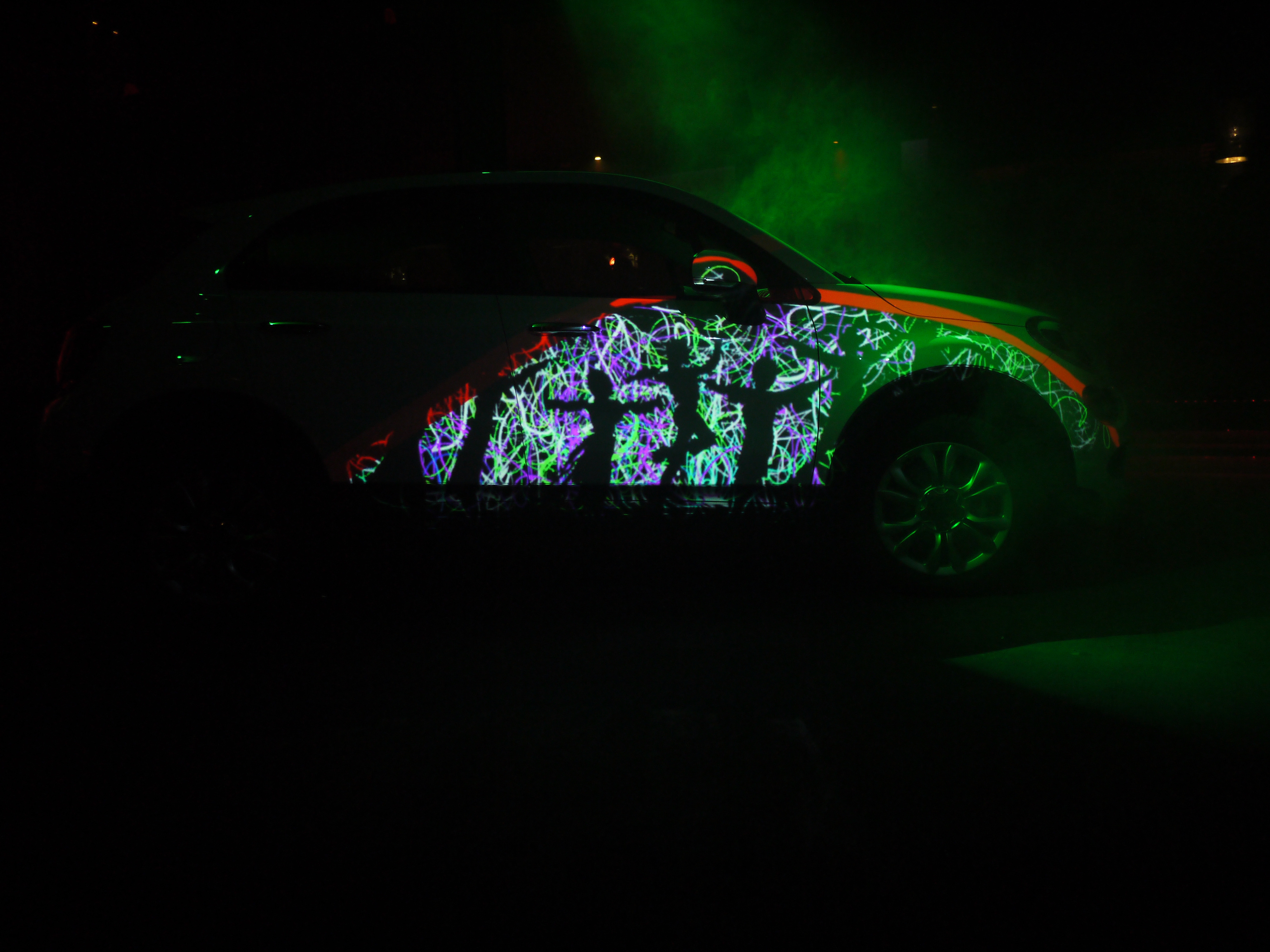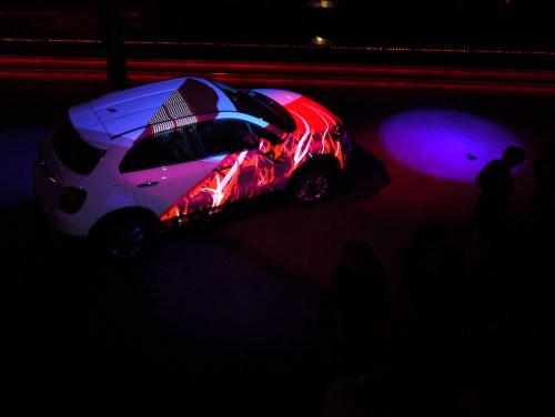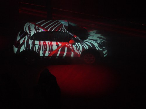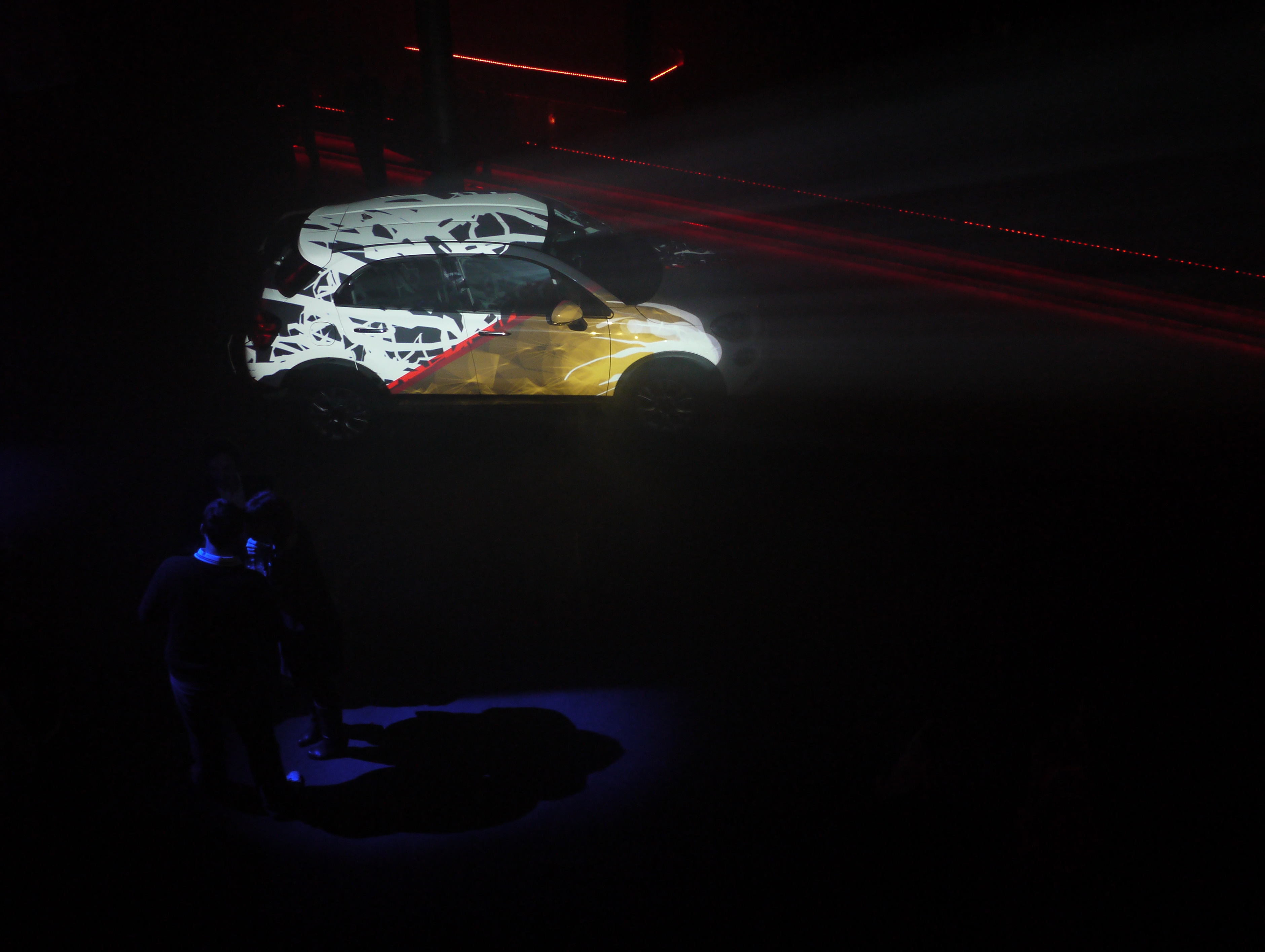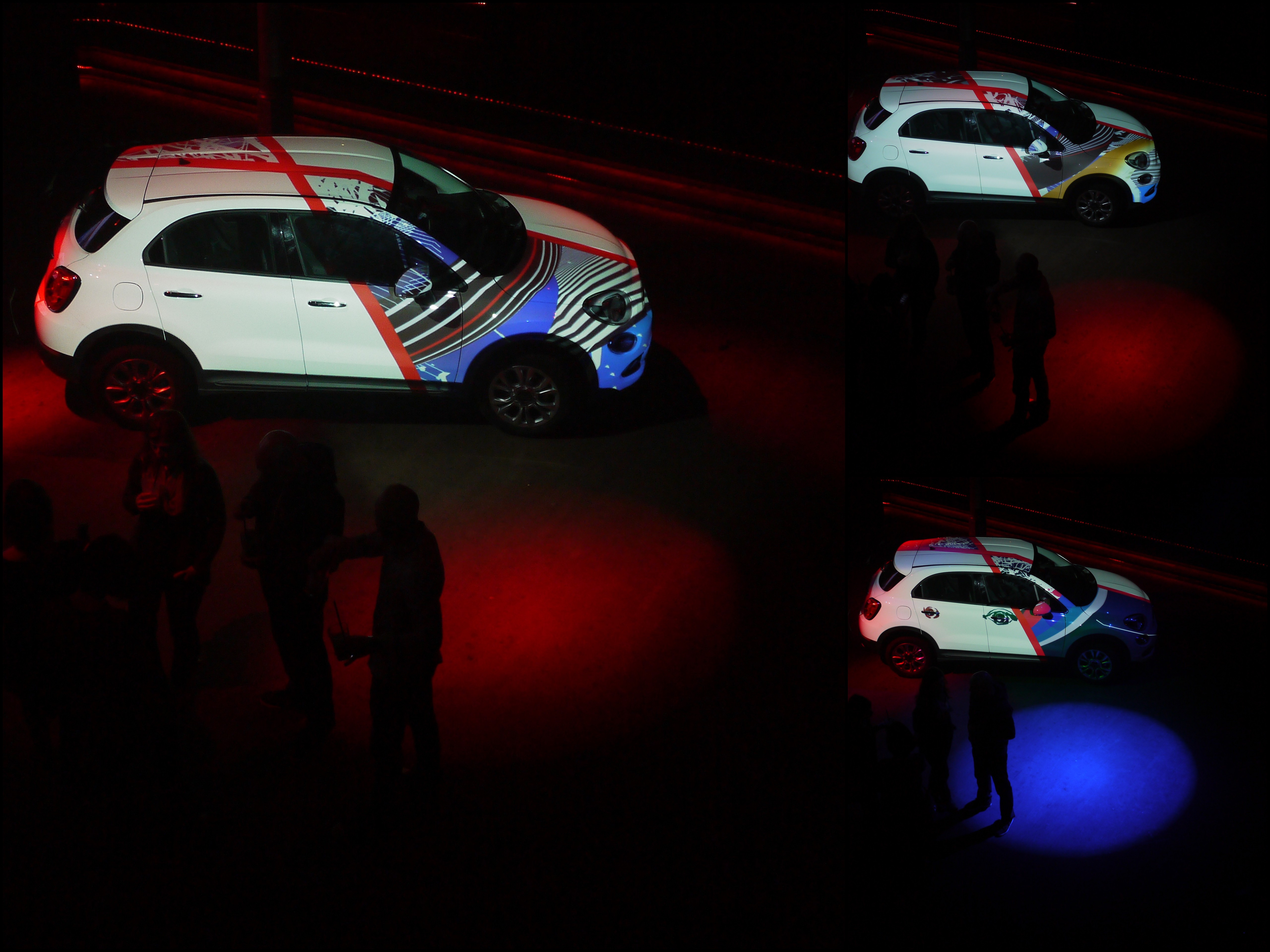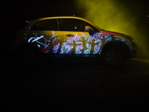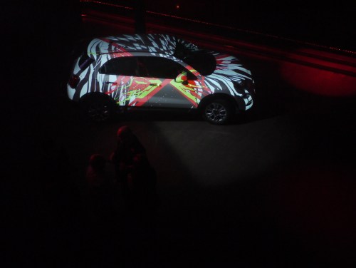 To end this posting – two photos from our final sequence, the first of the LED screen as seen from the balcony and then as our visuals appeared on the car.