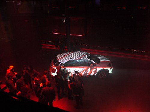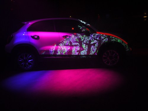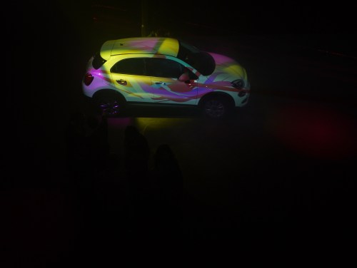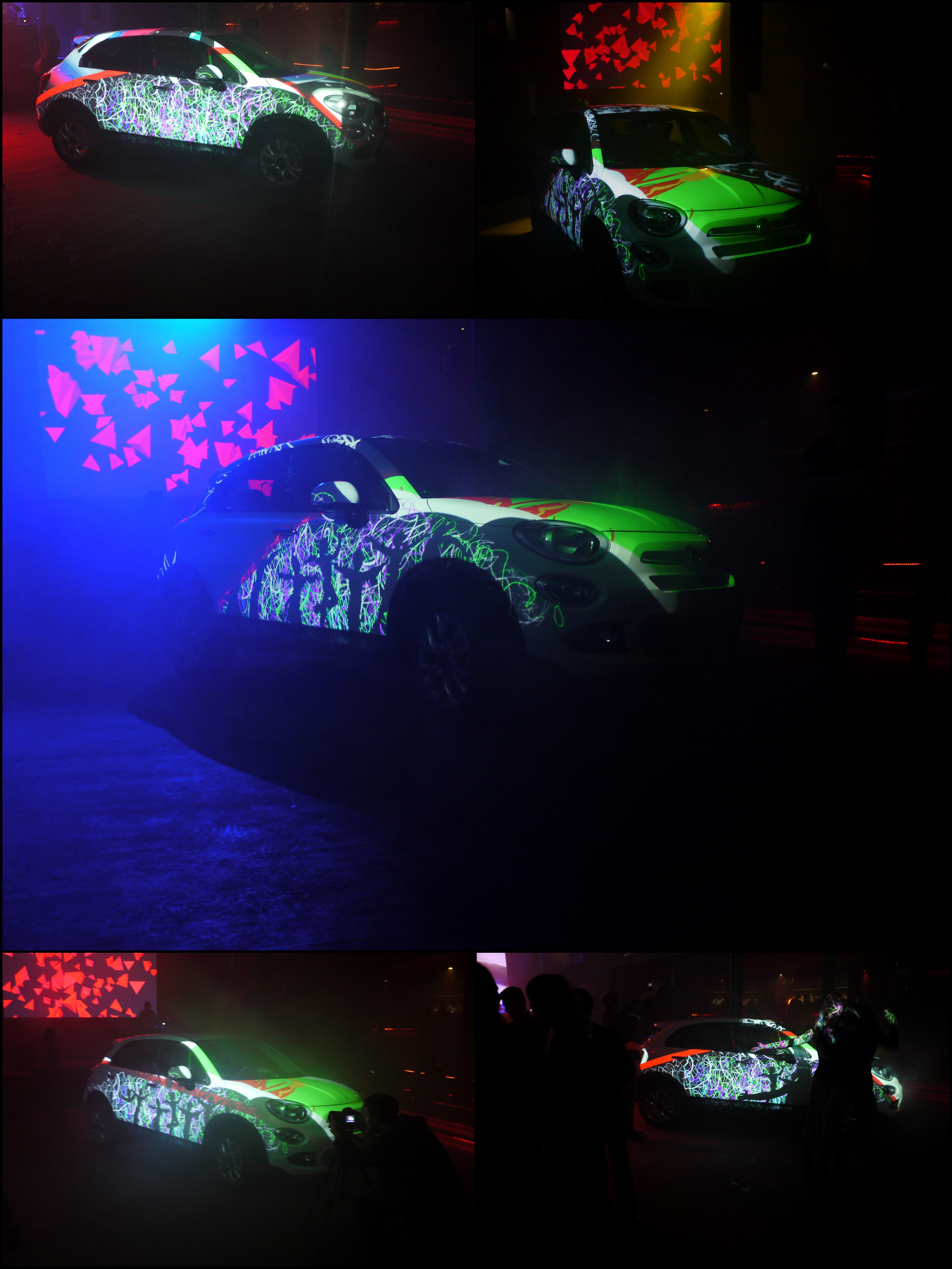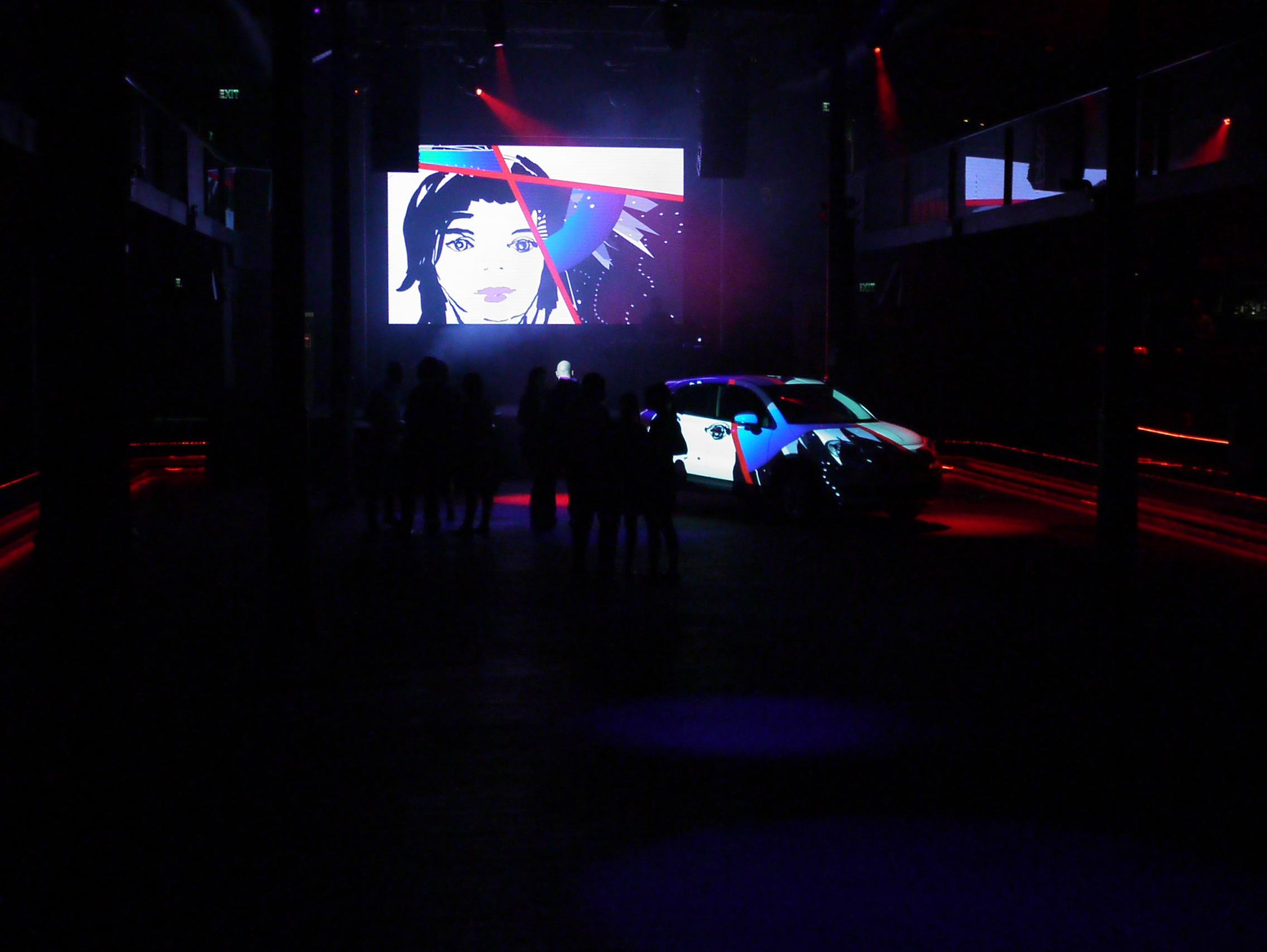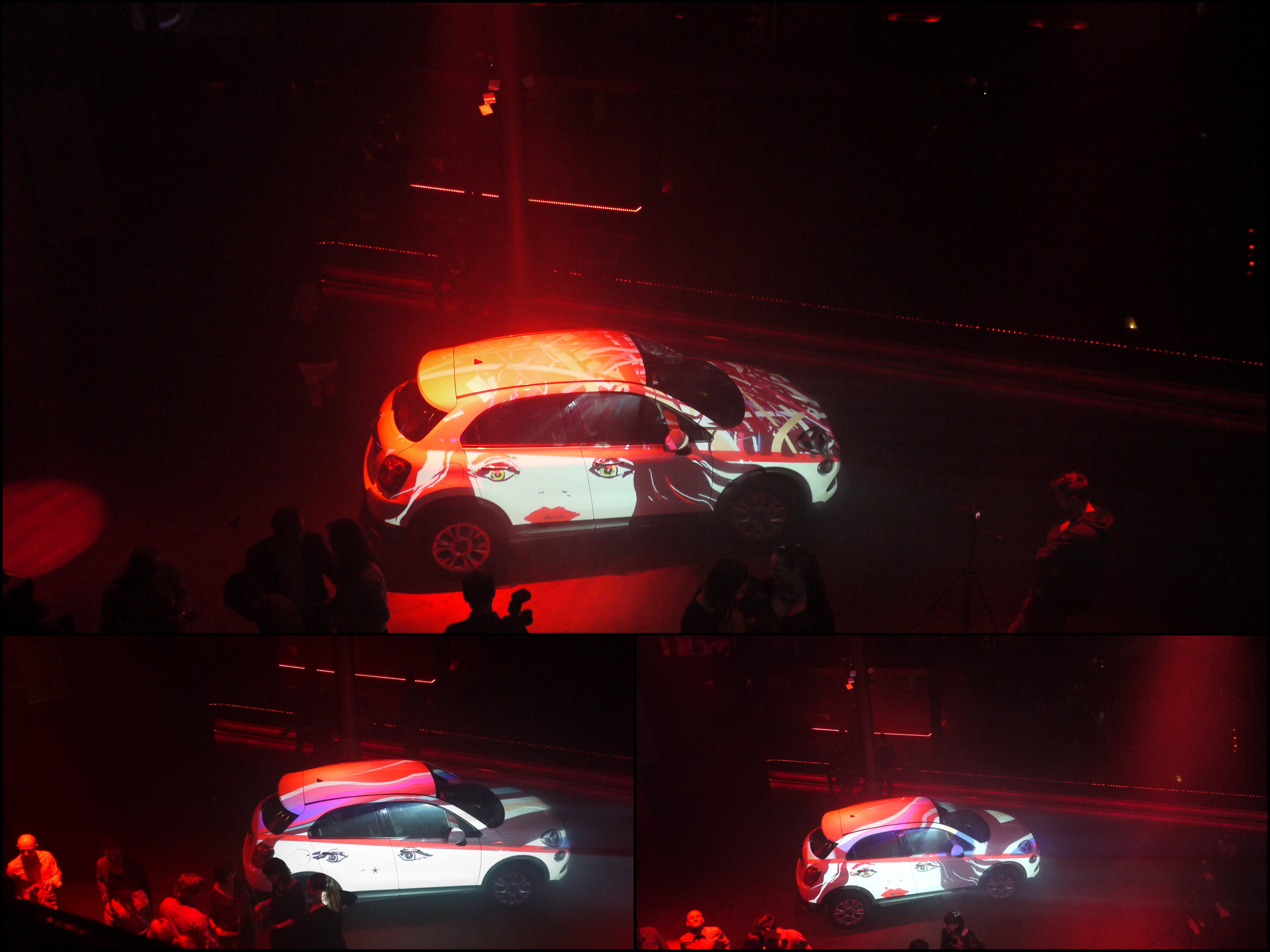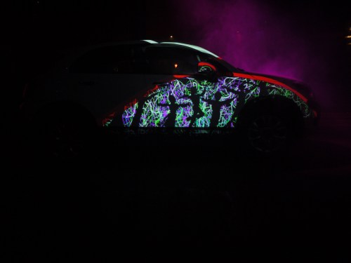 To end this posting – two photos from our final sequence, the first of the LED screen as seen from the balcony and then as our visuals appeared on the car.