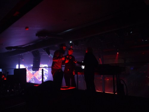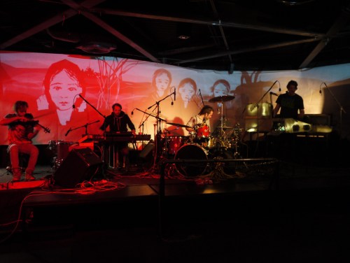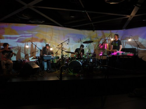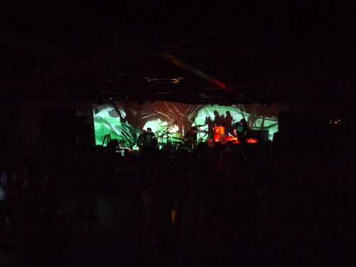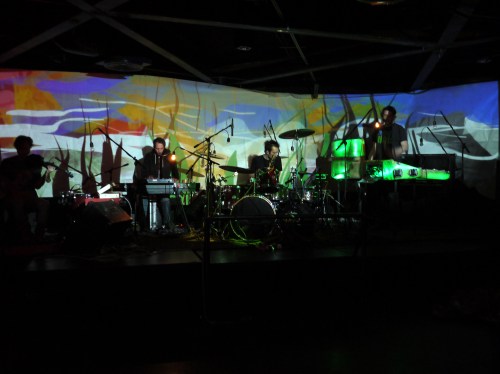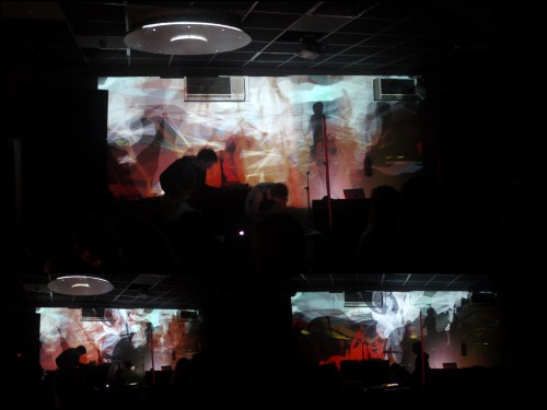 The photos above were taken at the rehearsal in the afternoon. When we arrived at Klub Na Rampě we put up white material across the full width of the stage behind the band and then I had a chance to do some drawing while Dima was busy programming the stage lights. Dima set up our video to record the performance but for now I’ll just post a few photos taken with my little camera.