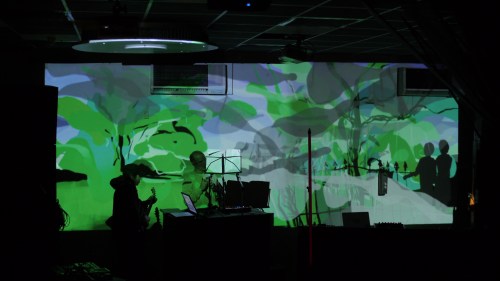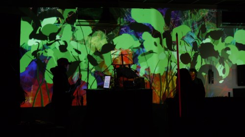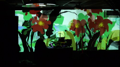 Below – after drawing these big flowers, the visuals began to look more like jungle than a garden, with the two musicians hidden in the foliage …