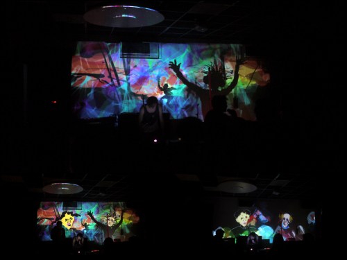 Last Friday we held this Transformania event at NEONE in Prague – both a party and nice Tagtooling opportunity for me to accompany some of our guests. First up on the programme were our Czech friends, Mutanti hledaj východisko. Last year I did some ‘mutant drawings’ for them when they were performing at the summer festival in Boskovice – so it was great to do some more scary images for this performance! The photos below show the progression of my drawings…